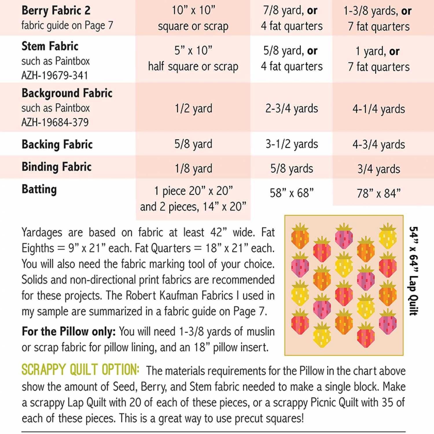 This pattern includes instructions for two quilt sizes and a quilted pillow cover featuring 8" x 12" patchwork strawberry blocks. (The blocks in this pattern are similar, but larger than the strawberries in my The Produce Section quilt.)