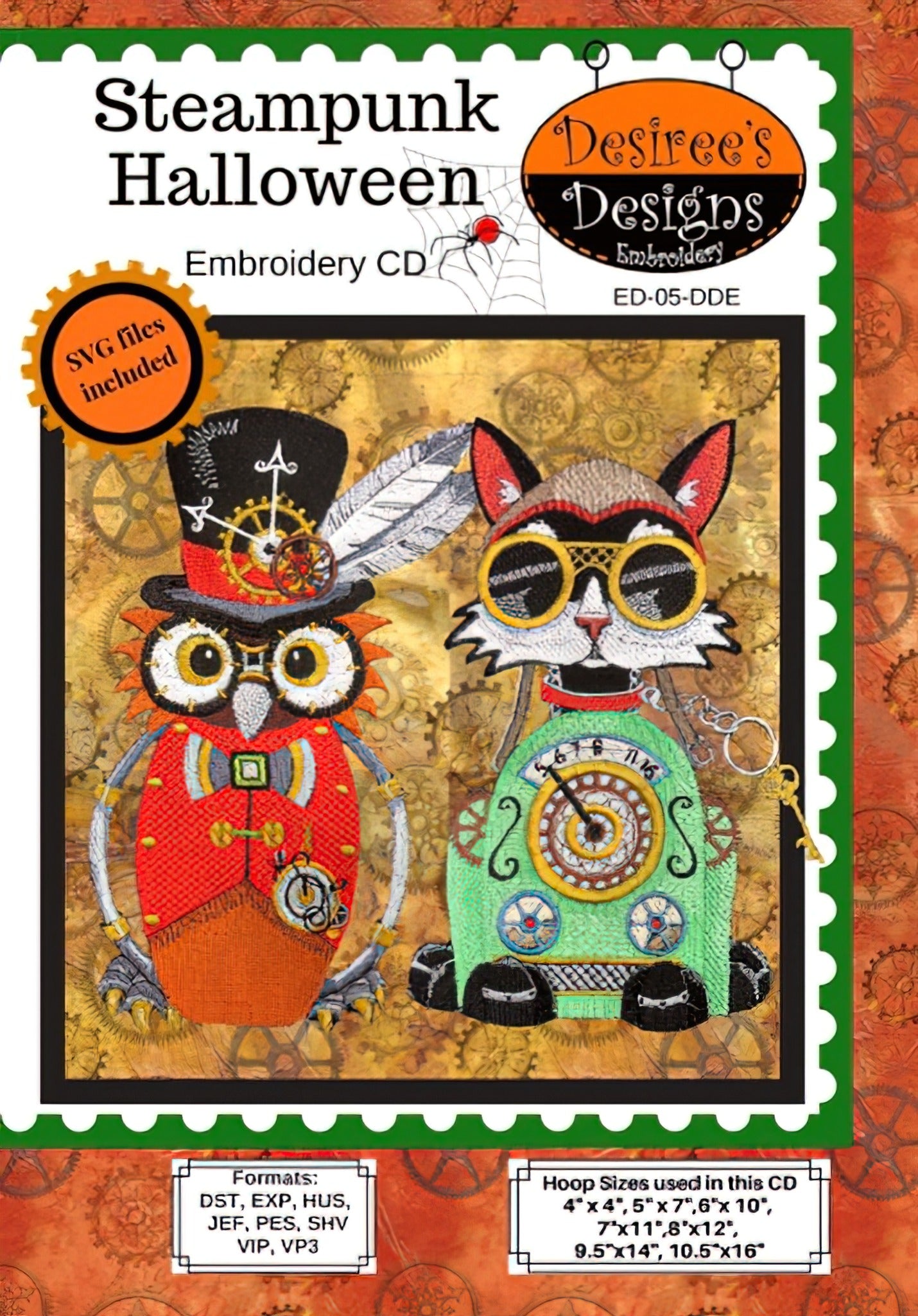 Our popular Steampunk Halloween Characters have come to life on our newest embroidery CD. Hoop sizes start at 4"x4" and go all the way up to 10.5"x16". You get both embroidery and applique designs for the larger characters. You are going to love adding these to all of your fun projects for Halloween. SVG files included, Instructions and color charts. Formats include DST, EXP, HUS, JEF,PES, SHV, VIP, VP3.#ED-05-DDE
