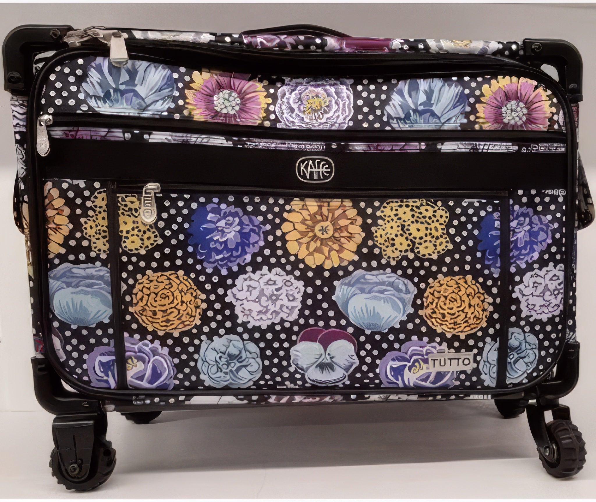 Exclusive Kaffe Fassett innovative transportation system from Tutto. On the exterior, the Kaffe Fassett signature Big Blooms print. Manufactured from ballistic nylon and features a fiberglass frame two inside straps for security & mesh pockets for storage. 23"Lx14.25"Hx14"D. Top access 19"Lx10"D or side load. Folds to 3" for storage. Fits all 7 Series Bernina Machines. Stacks up to 150 lbs and weighs only 11 lbs empty.