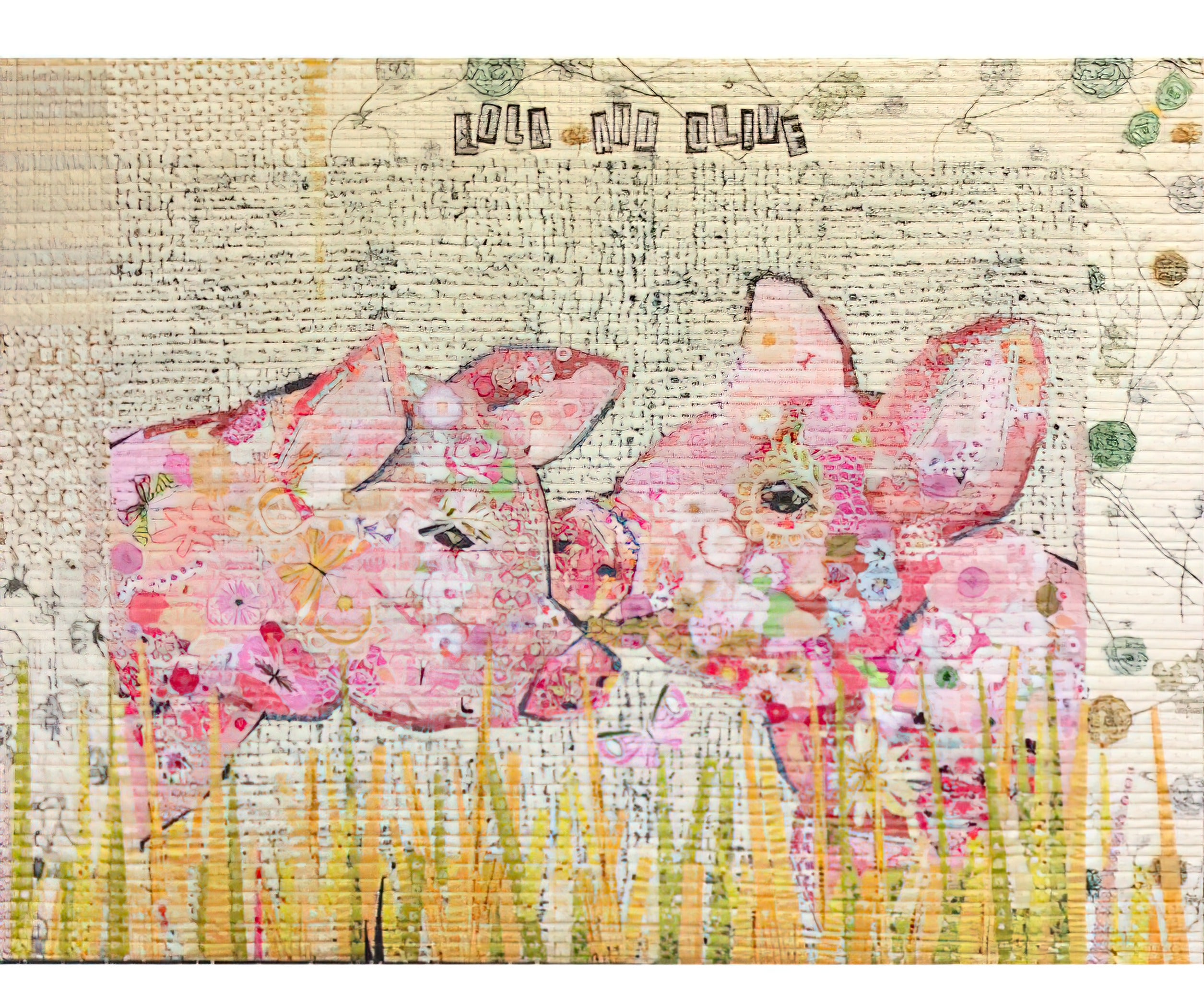 Laura Heine's Lola and Olive, the Pigs collage pattern. Full size pattern and complete instructions included. Finished size: 38" x 32".