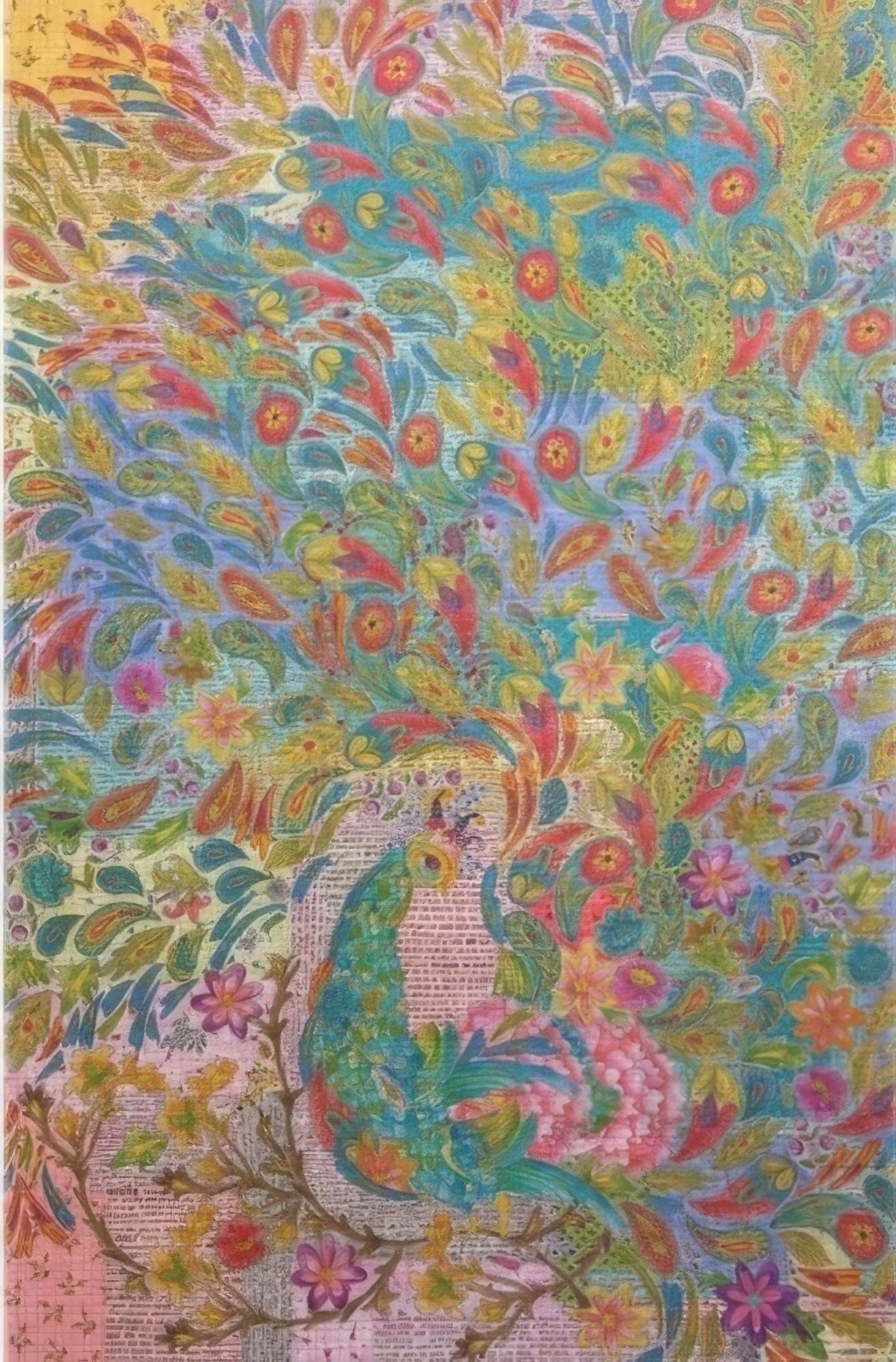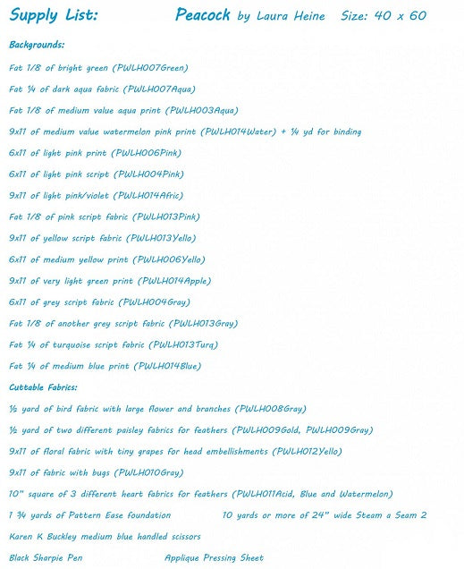 Peacock Collage Pattern by Laura Heine is shown using Laura's Bird In Hand fabric collection by Free Spirit Fabrics. Other fabrics can be modified and used to create this quilt. Size 40" x 60".