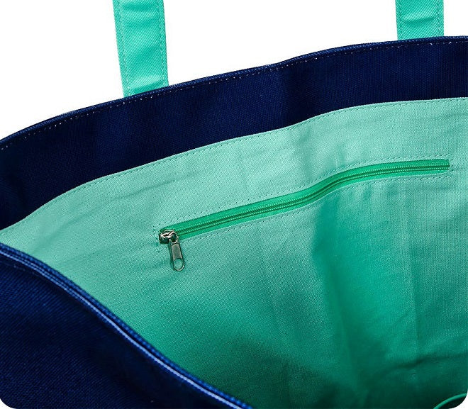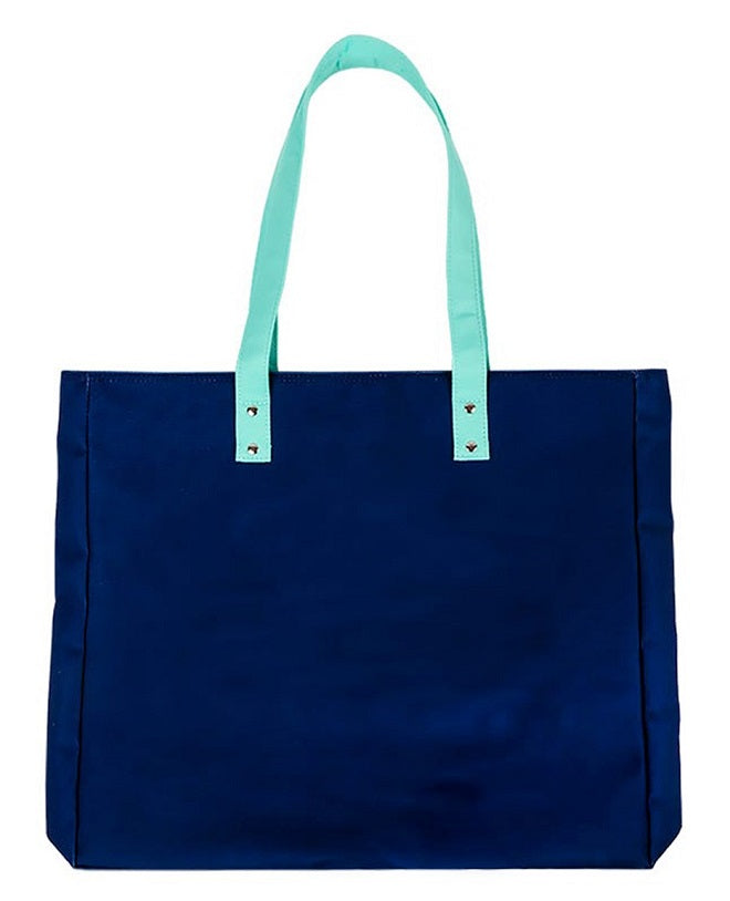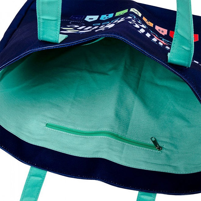 The Bonnie & Camille Quilt Bee Tote Bag is just big enough for all your quilt event needs. With an eye-catching graphic on classic navy and a pop of aqua on the handles and lining, this sturdy canvas tote bag is the perfect gift for your quilty BFF! Size: 14.5" H x 17.5" W 2.5" D.