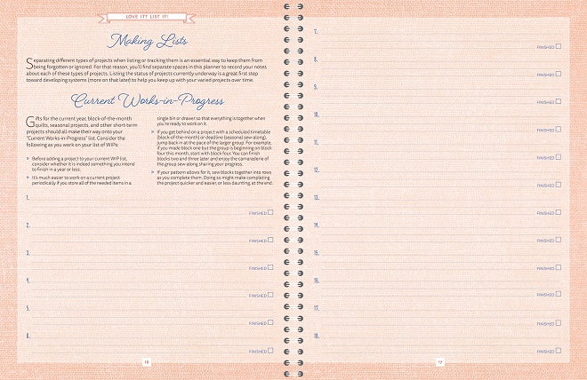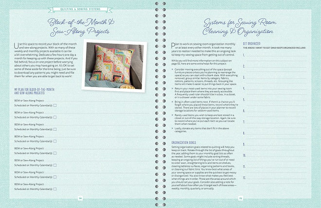 Expert planner and organizer Sherri McConnell of AQuiltingLife.com guides you step-by-step, sharing tips and resources so you can easily and efficiently organize your quilting projects, supplies, and time. Gain a complete perspective of the systems and ideas Sherri finds most helpful. Keep a thorough record of your quilting projects, patterns, tools, notions, and more. Track your progress. Learn how better organization can lead to more free time to sew. Build your skills as you work through the planner month by month. Don't wait to get started (you fill in the months and dates). Organization isn't a one-size-fits-all system, but the basic principles inside will help you develop the ideal program for YOU. Let's get to work!