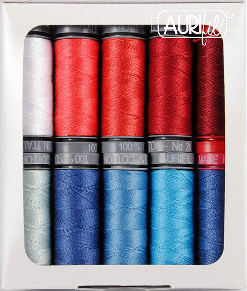 This beautiful selection of thicker weight (and hard to find!) threads coordinate perfectly with Amanda’s Celestial Lights fabric collection. These are the threads that are used in both the red and blue versions of her Floret wallhanging, which you can find as a printed pattern or a PDF. (The 12 wt. threads are used for the stems, and the 28 wt. threads are used for the applique.)