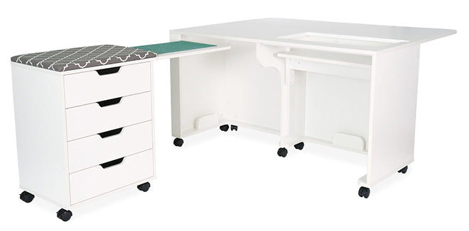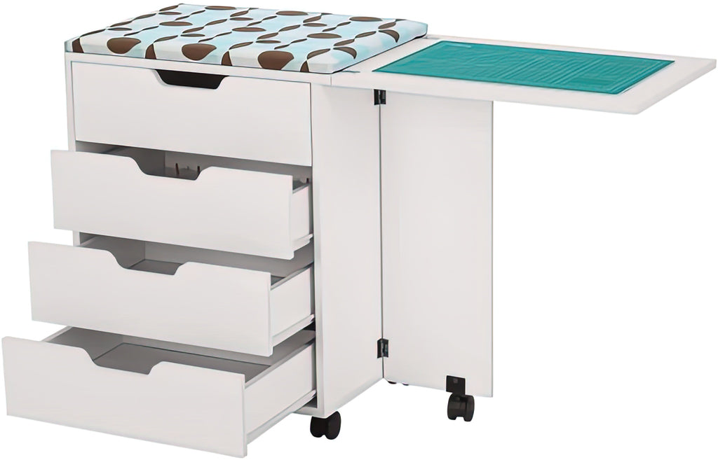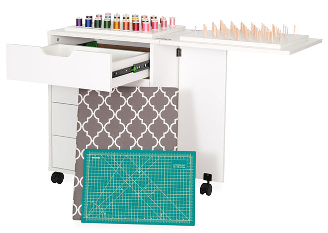 Did someone say storage!? Shirley Storage Cabinet is dynamic, multi-functional storage caddy, designed to perfectly complement your primary sewing workstation – most notably the Laverne Sewing Cabinet by Arrow Classic Sewing Furniture! Shirley features a built-in ironing station, cutting mat, and 4 drawers of dedicate storage for sewing notions and accessories!