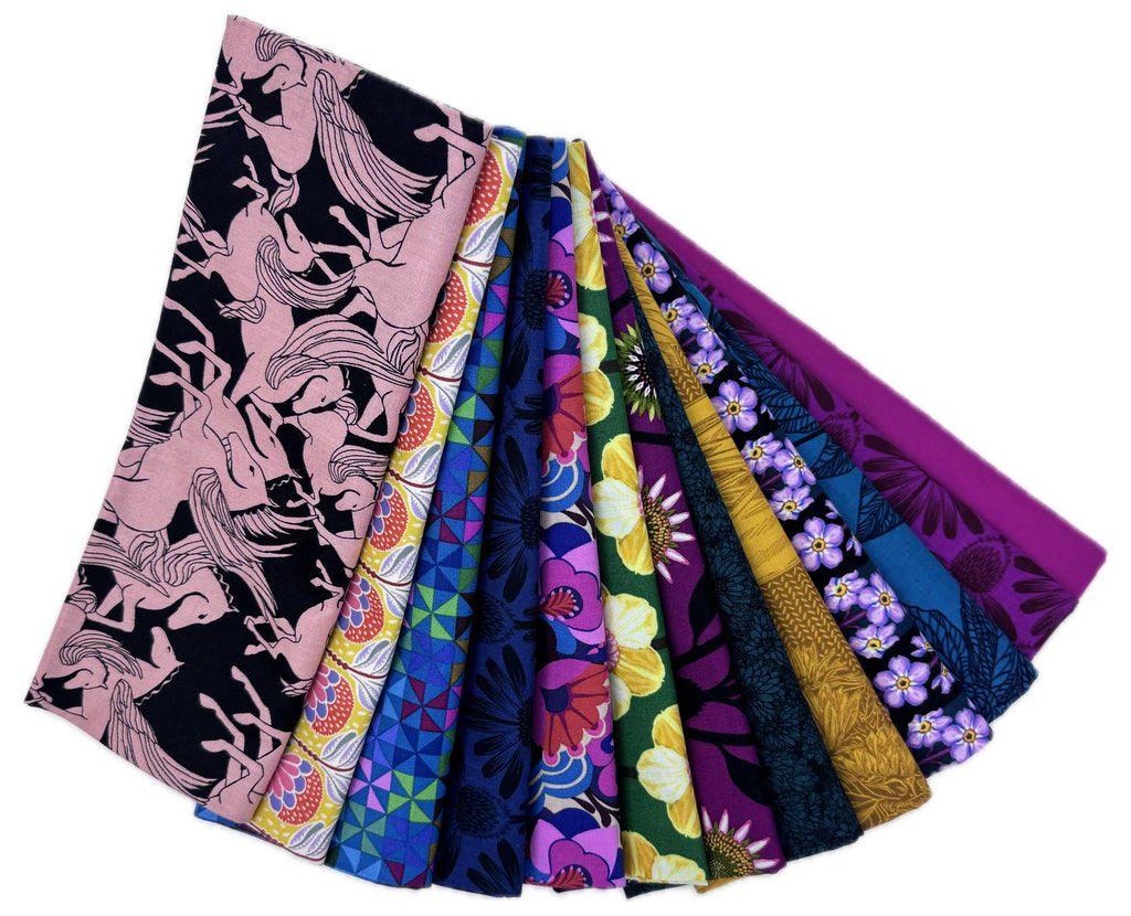 Bespoke Quilt No.1 is a vibrant, symmetrical design focusing on the floral motifs towards the center of the quilt. Fabrics are designed by Anna Maria Horner( Parry). Piecing and some appliquéing is used in this quilt, great for an intermediate. Finished quilt size is 71"x85".