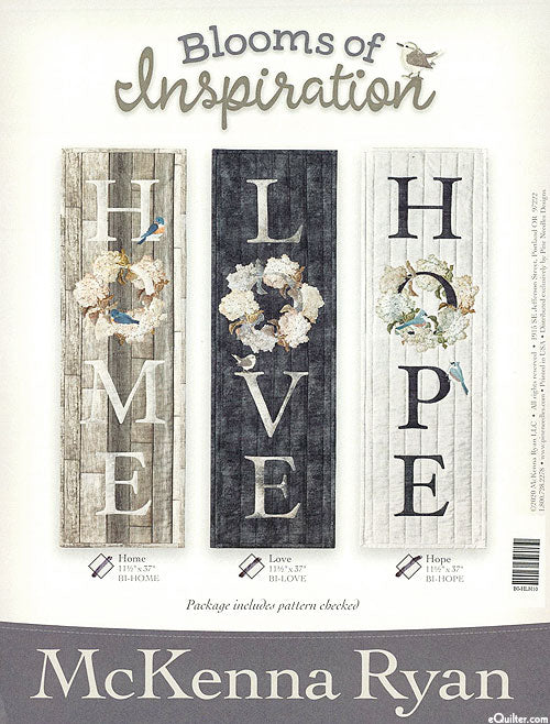 This raw-edge applique pattern will fill any house with warm feelings of hope, love and home. Each block from this pattern collection can be sewn on its own as a piece of wall art, or you can combine the entire collection to create an inspirational quilt. 'Home, Love & Hope' patterns from the 'Blooms of Inspiration' collection by McKenna Ryan, finished sizes are about 11-1/2" x 37" for each.