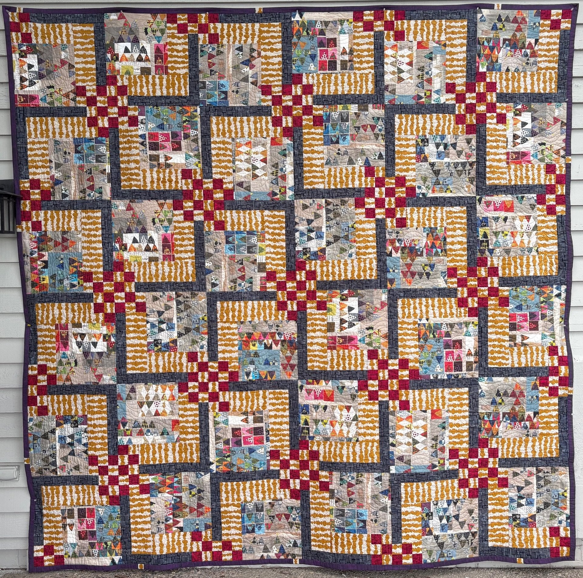 Big off center focus with a checkerboard splash for the accent. Choose one center fabric or many. Two block sizes, 18" or 13 ½" and 6 quilts from wall to queen. There are 3 quilt sizes for each block size.