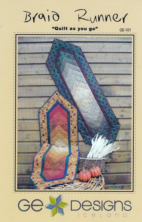 G.E.Designs Braid Runner Pattern- Braid Runner is a great looking table runner that is sewn with a "quilt as you go" method, which is really fast & easy. When you are done piecing the quilt, just bind it and you're done! It's fun to play with the fabric colors to create a 3D effect by making it go from the light center out to the dark borders. Comes with picture, pattern and complete instructions. Finished size is approximately 17"x 52".