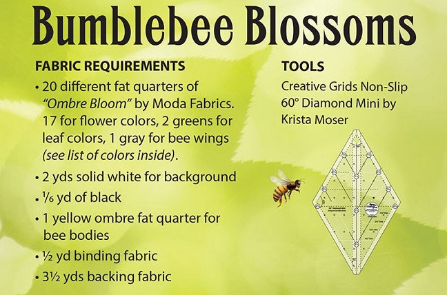 Up your quilting game with this charming pattern! Bumblebee Blossoms gives you a complicated look without tedious piecing. Gain confidence with angles and color placement. This quilt is constructed of three main blocks: the flowers, the bees, and the leaf blocks. Each one illustrates a different technique which are valuable additions to your quilting skills library. Use ombre fabric to get the most out of shade and value, or use scraps from your stash for an eclectic look!#TQL10017