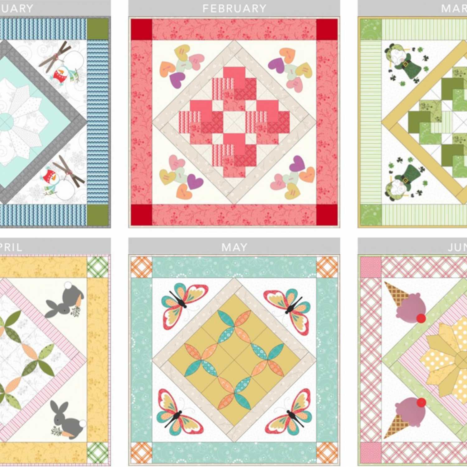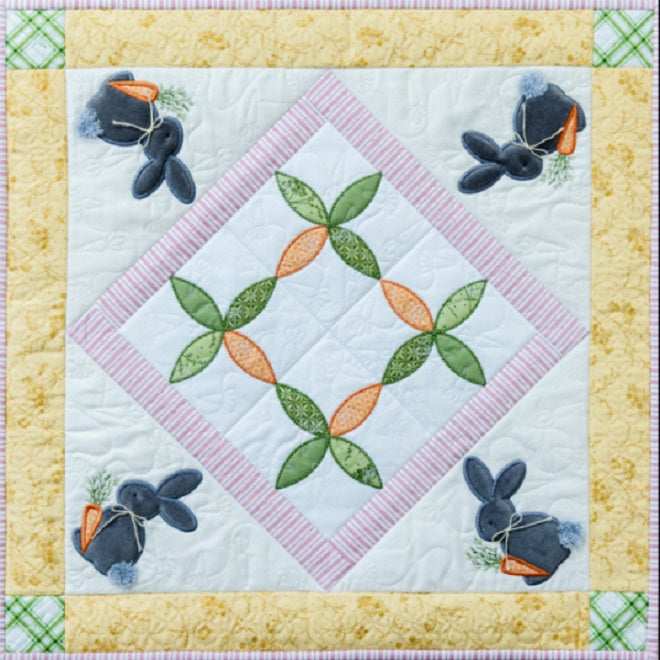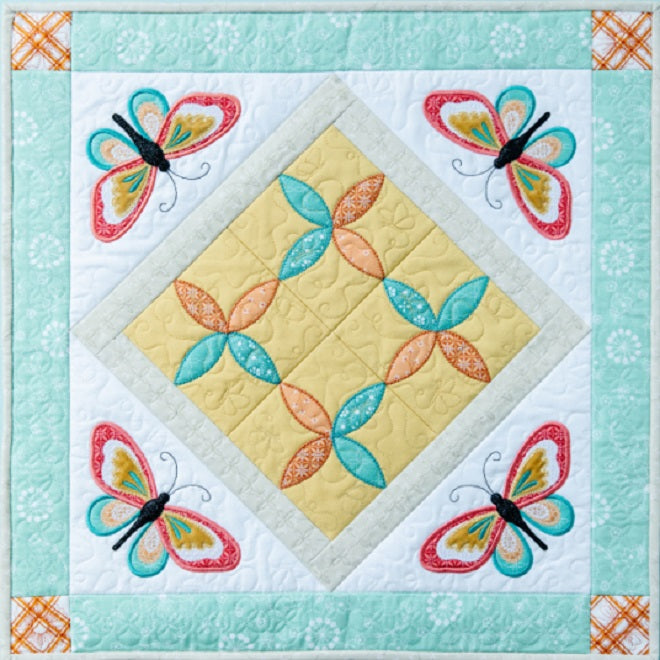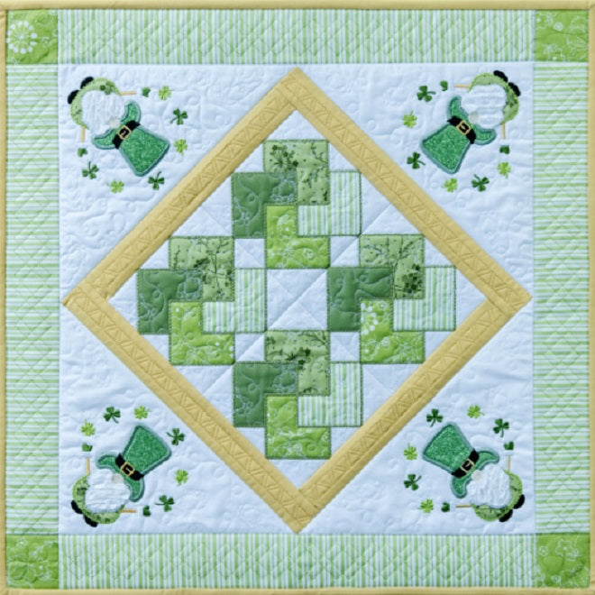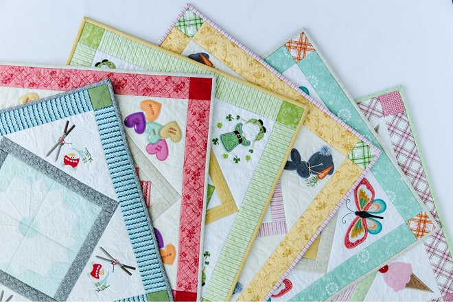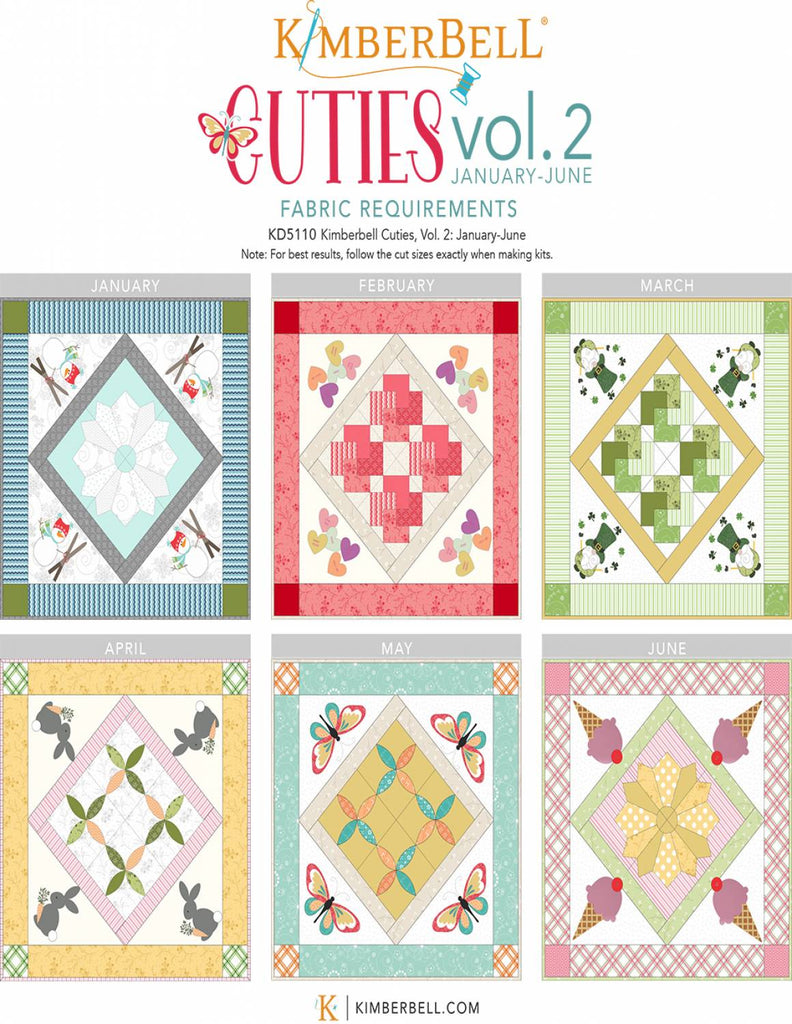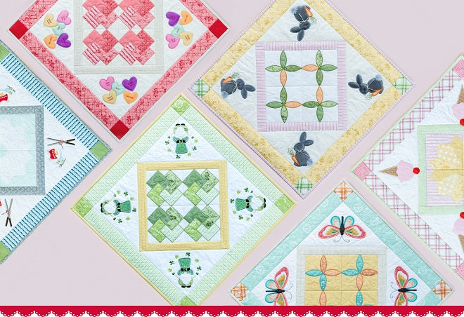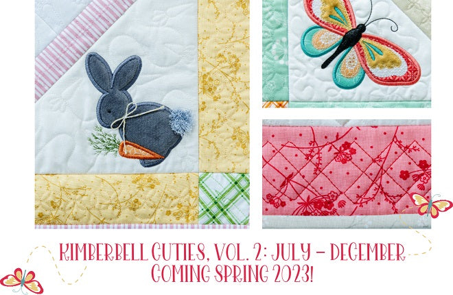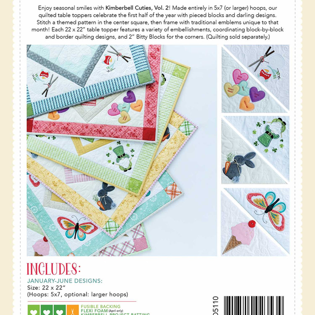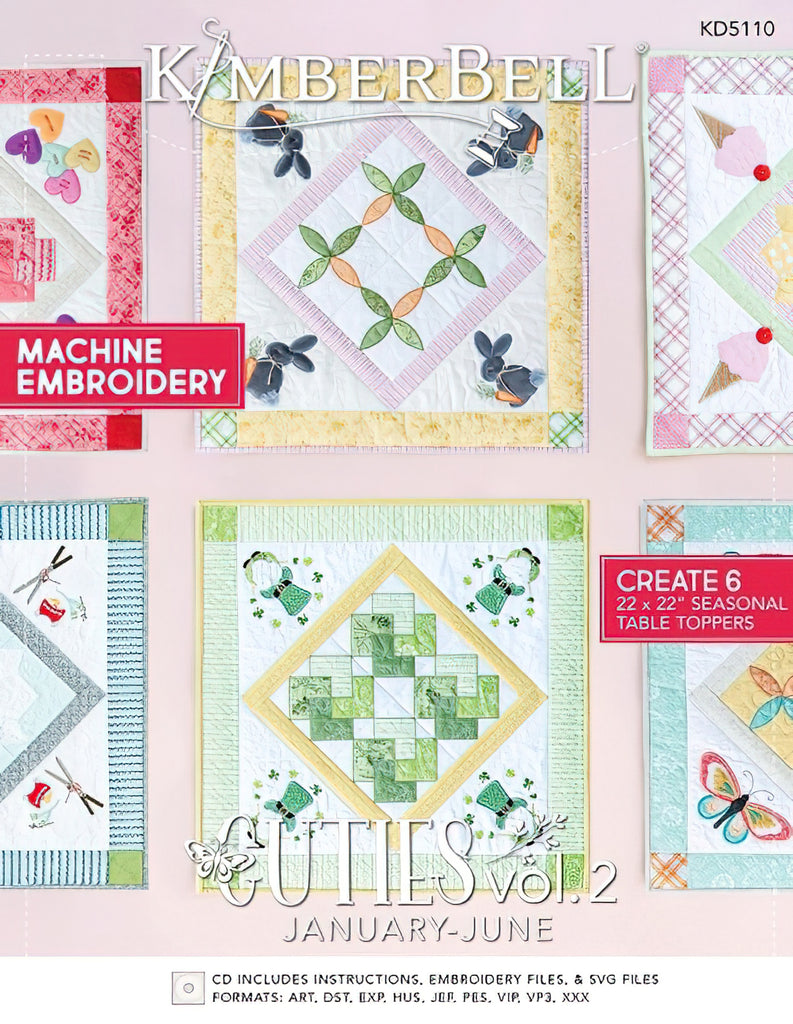 Enjoy seasonal smiles with Kimberbell Cuties, Vol. 2: January-June! Made entirely in-the-hoop of your embroidery machine, our quilted table toppers celebrate the first half of the year with pieced blocks and darling designs. Stitch a beautiful themed pattern in the center square, then frame with adorable snowmen, conversation hearts, leprechauns, and more! Each 22" x 22" table topper features a variety of embellishments, coordinating block-by-block and border quilting designs, and 2" Bitty Blocks for the corners. (Quilting sold separately.) Made in 5x7 (or larger) hoops, Kimberbell Cuties are a festive way to brighten each day!