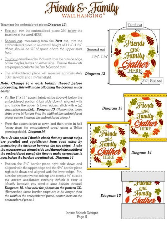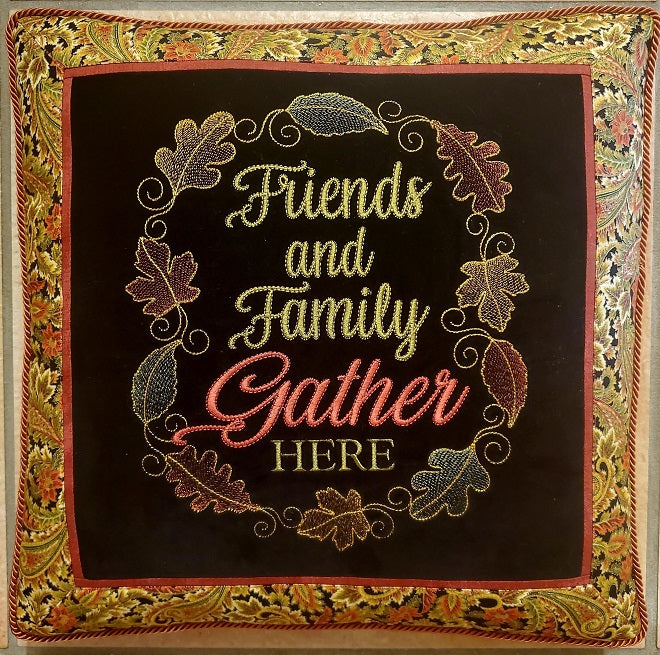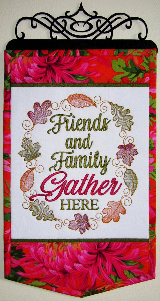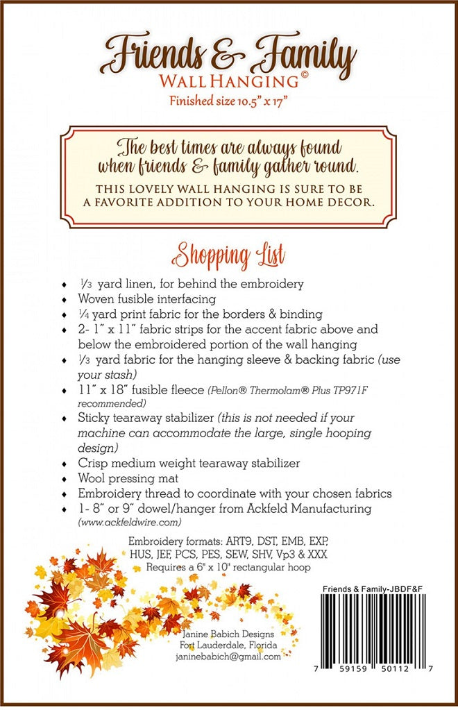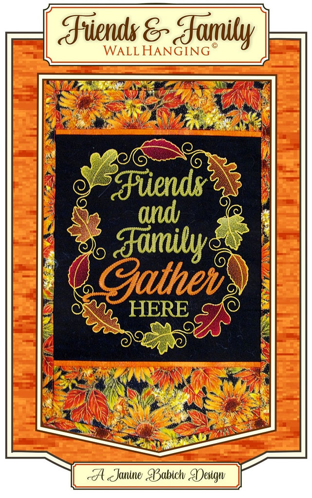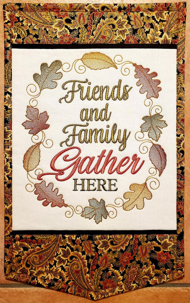 The best times are always found when friends & family gather 'round.' This lovely autumnal wall hanging is sure to become a fall favorite for yourself or made to give as a gift. Its narrower size makes it a perfect addition to the room where everyone seems to gather during the holidays...the kitchen. Finished size- 10 1/2" x 17" CD includes embroidery formats: ART9, DST, EMB, EXP, HUS, JEF, PCS, PES, SEW, SHV, VP3 & XXX. Minimum hoop requirement- 6" x 10" hoop.