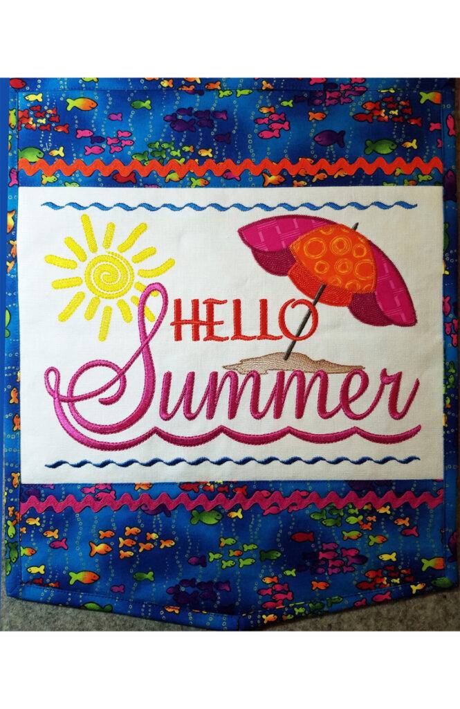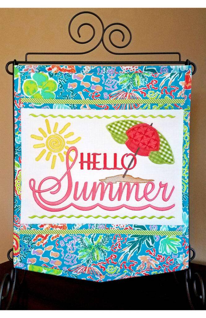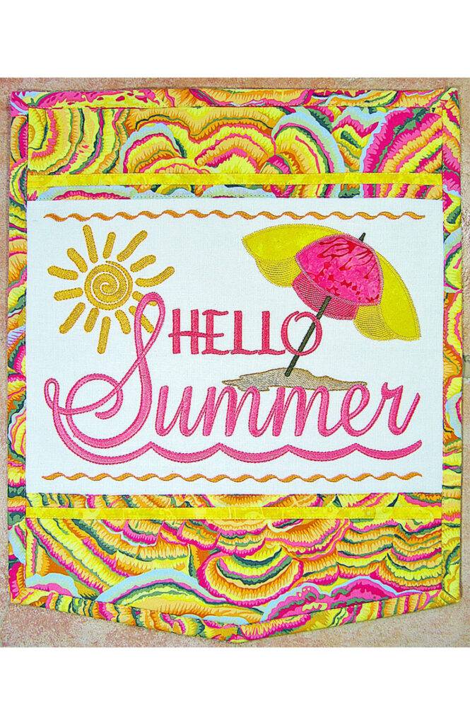 A beach umbrella and a little bit of sand is all you need to get yourself in a summer state of mind. This sunny embroidered wall hanging (or table top display) features an appliqued umbrella, bold satin stitch lettering and bright border fabrics. Put your flip flops on and say Hello Summer!