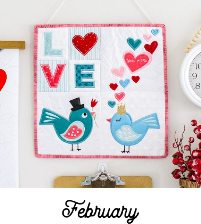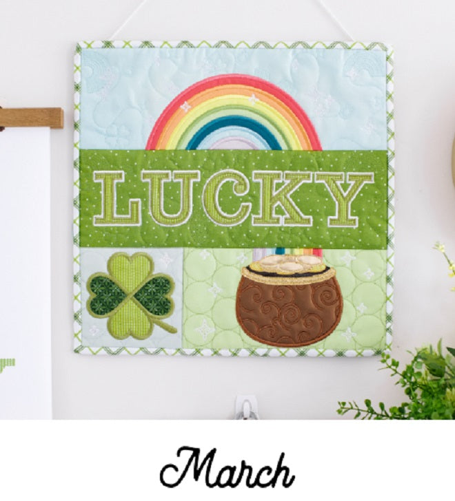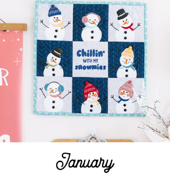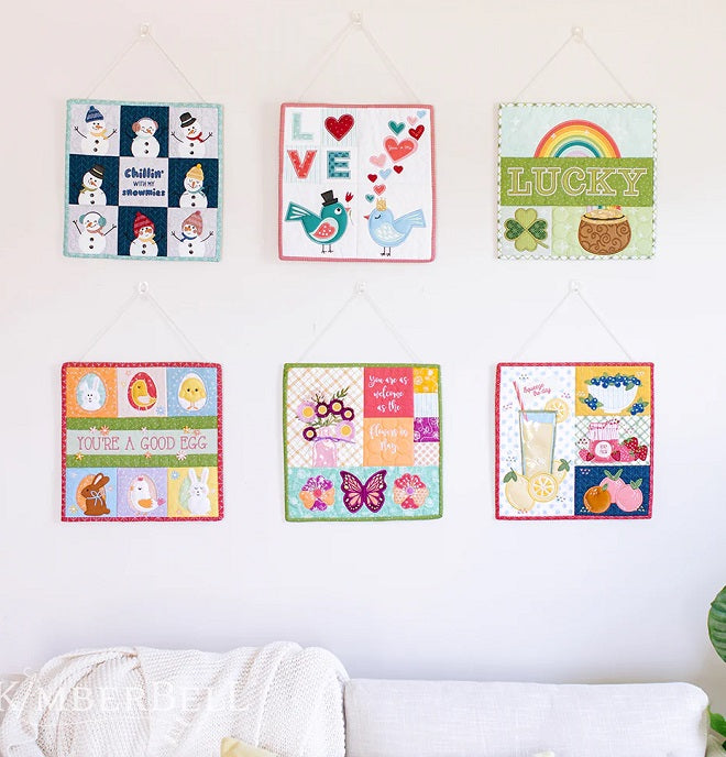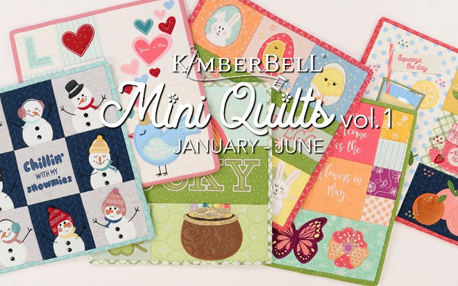Create seasonal gifts and decor with Kimberbell Mini Quilts, Vol. 1: January-June! Made in 5" x 7" (and larger) hoops, each 12" x 12" mini quilt celebrates the first half of the year with darling techniques and beautiful blocks. Stitch each block on your embroidery machine, add optional background quilting (sold separately), and sew the blocks together on your sewing machine! From snowmen and shamrocks to lovebirds and more, Kimberbell Mini Quilts are always in season.