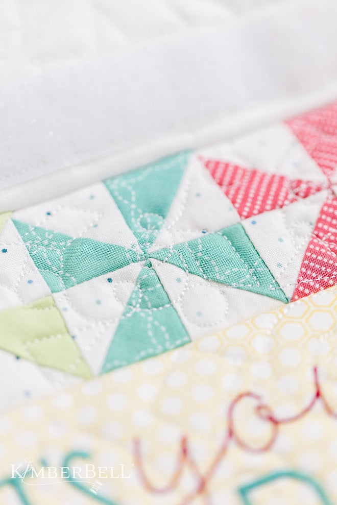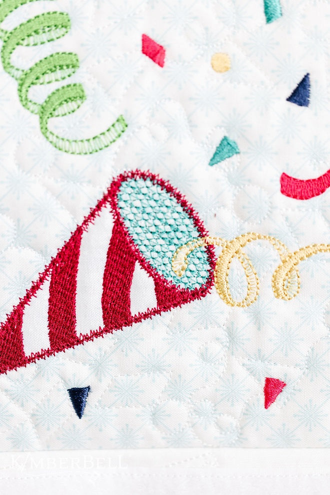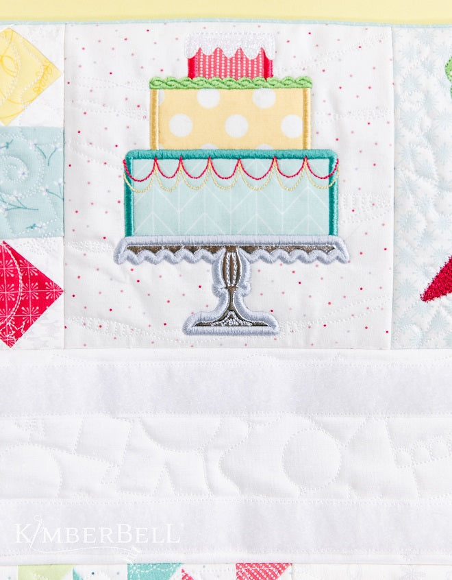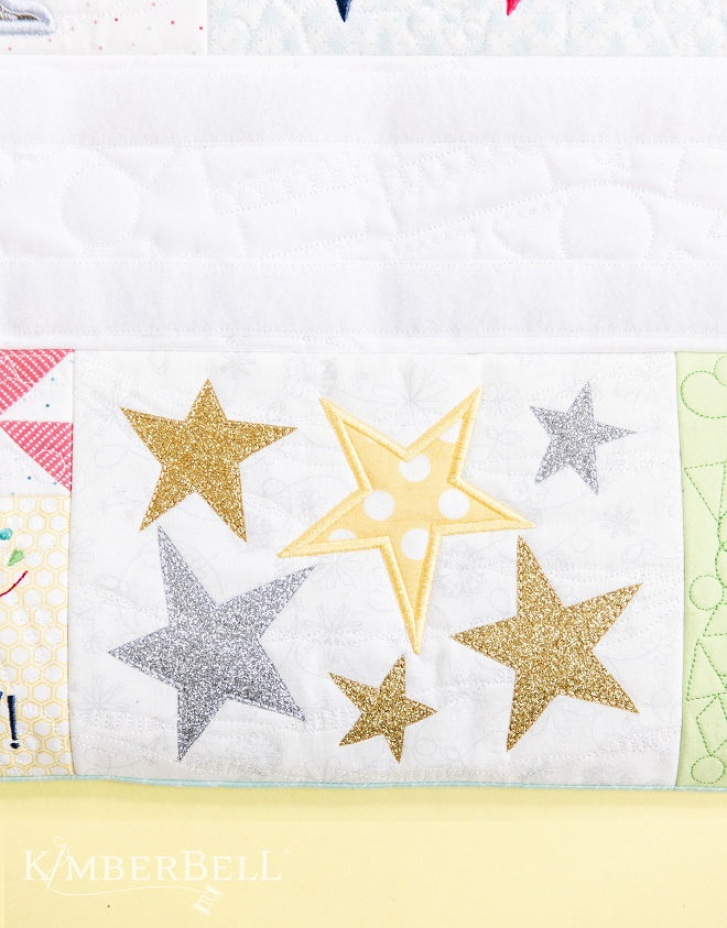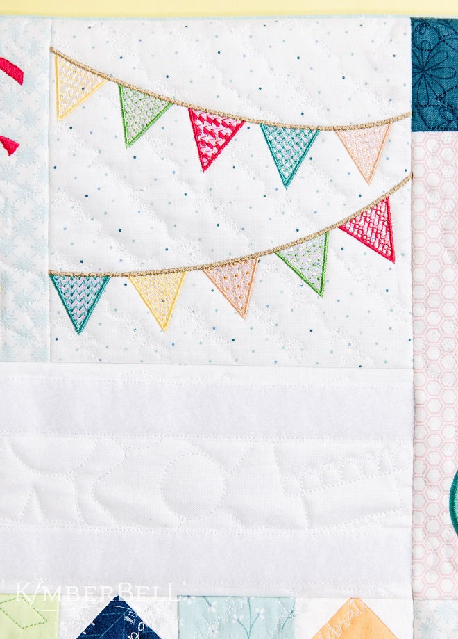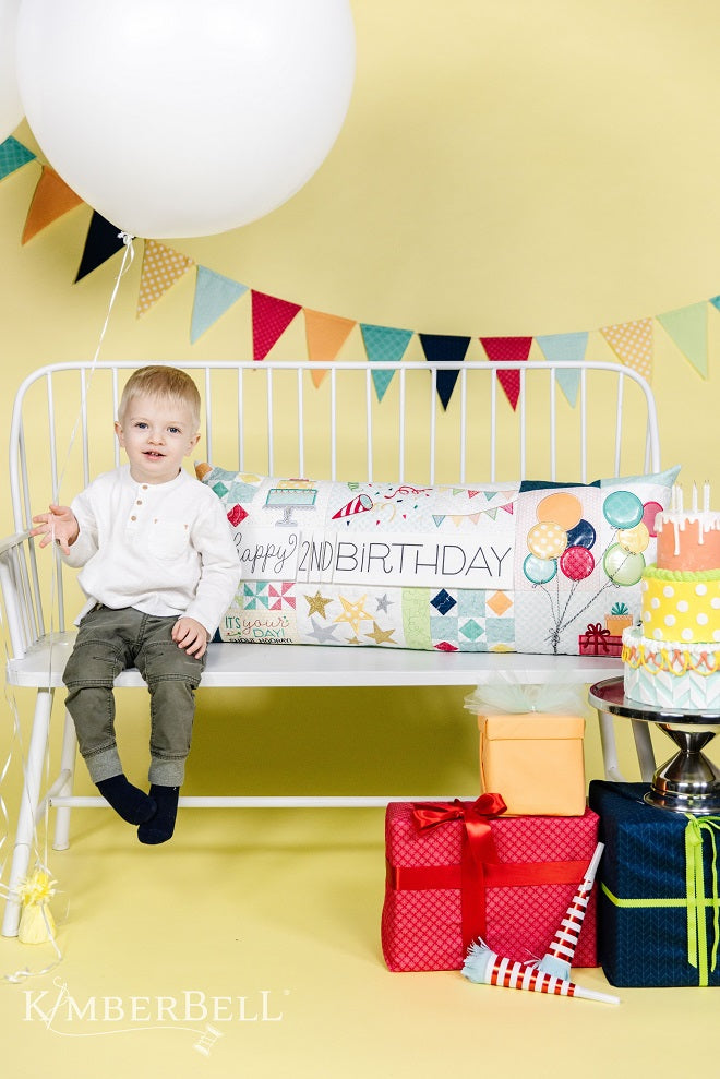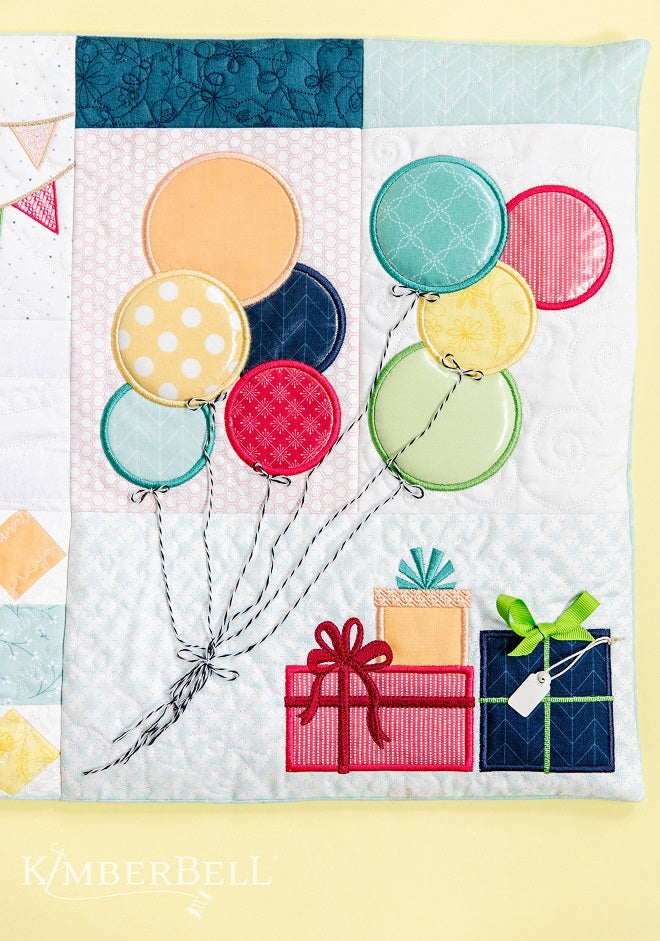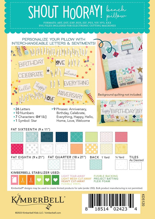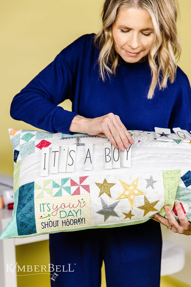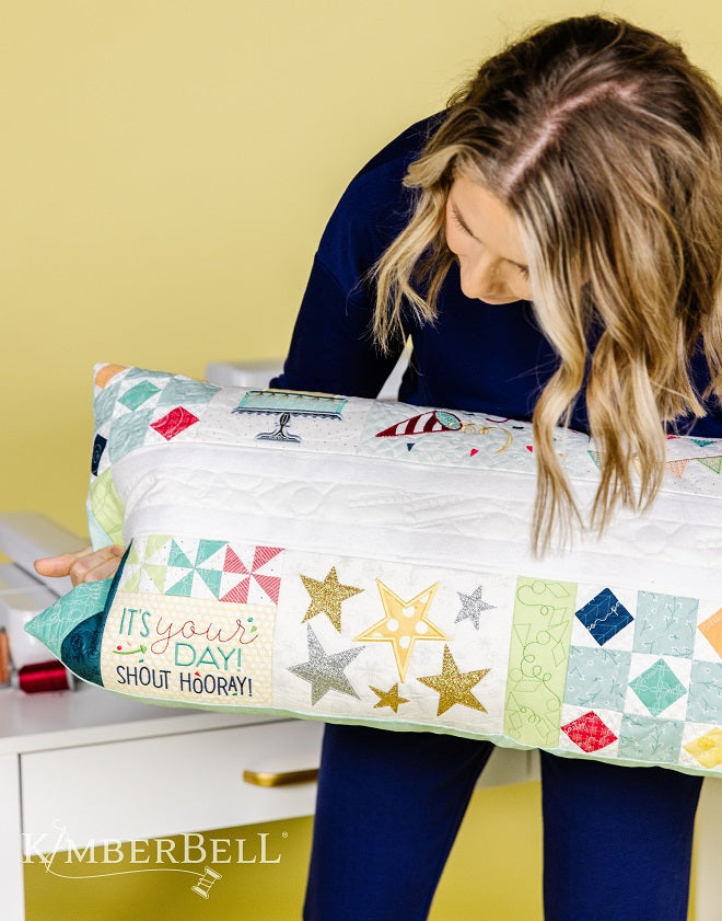 "It's your day! Shout hooray!" Kimberbell's Shout Hooray Bench Pillow celebrates the people you love with confetti, cake, and so much more. Stitch names, dates, and greetings with our included alphabet and sentiments, then feature your message in our letterboard panel! Applique Glitter, Embroidery Leather, and iridescent Mylar add sparkle and shine to the stars, cake, and banner, while bright balloons float from strings of Kimberbell Twine. Add Flexi Foam and Iron-on Vinyl to make balloons "pop!" Pretty pinwheels and nine-patch blocks are easily pieced in-the-hoop, and applique gifts are topped with beautiful bows. With optional background quilting and delightful designs, your Shout Hooray Bench Pillow is perfect for every special occasion!