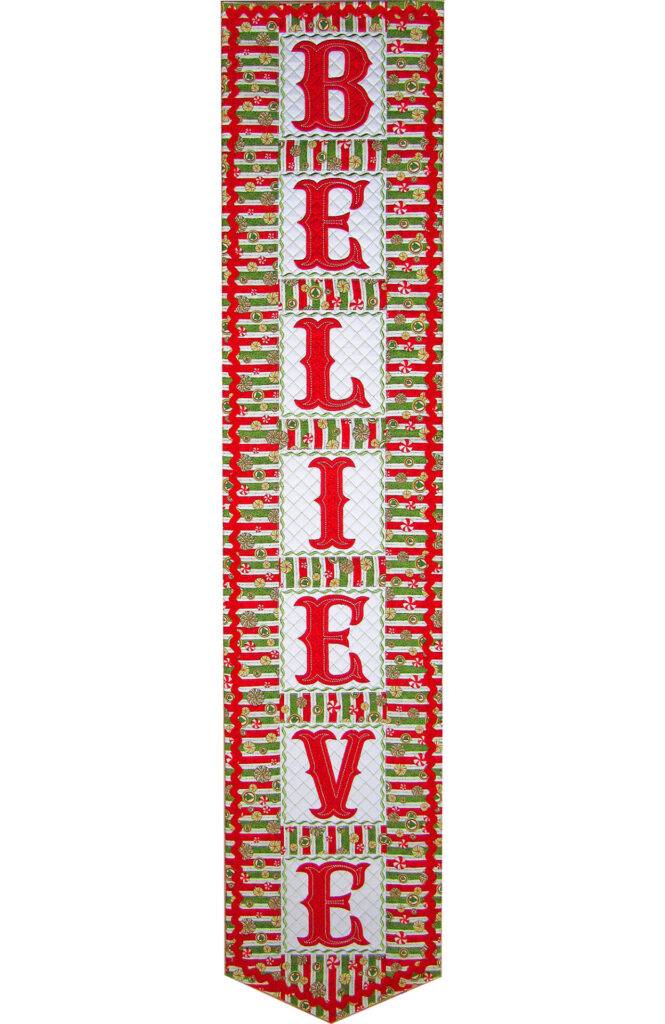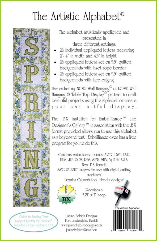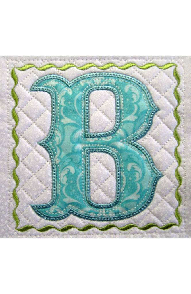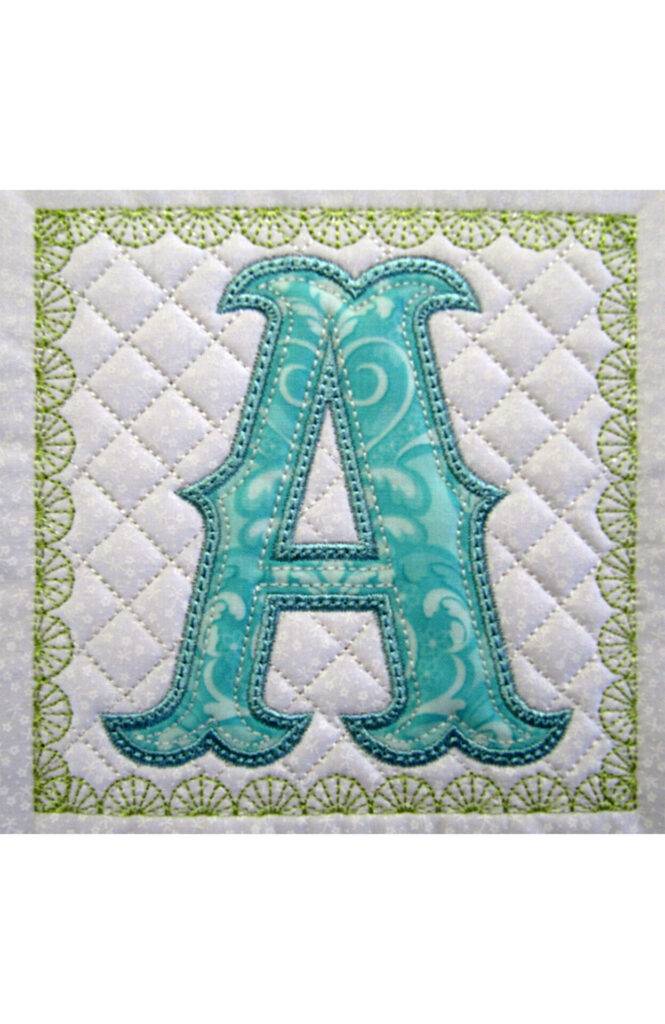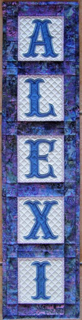 – 26 appliqued letters set on 5.5″ square quilted background with inset rope border