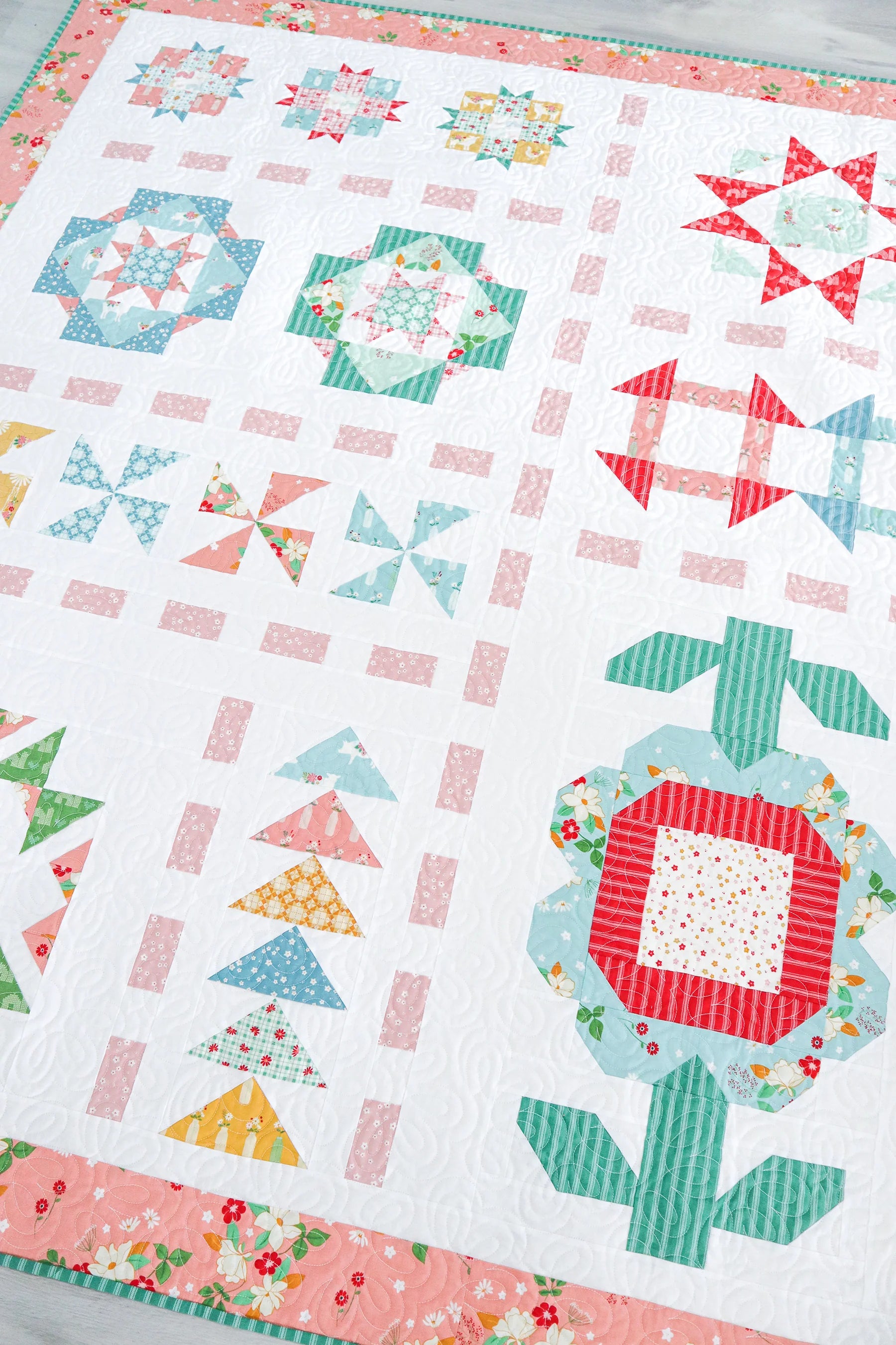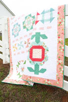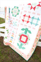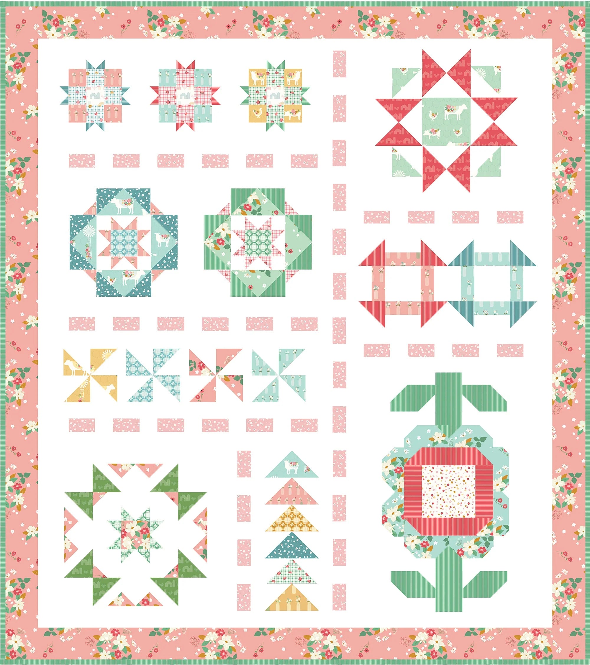 Get ready for the Country Fair with this pretty sampler style quilt! The quilt is made up of several styles of blocks - everything from stars to pinwheels to a big flower - and they are all tied together with a sweet dashed sashing.