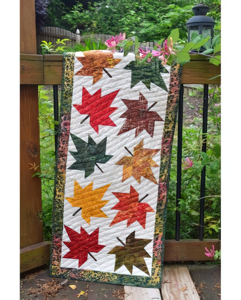 Just (10) 10" squares for the leaves and one for the stems is all you need to create this stunning Fall table runner. It is the perfect project choice to learn a few new techniques with the Creative Grids Creative Grids Kitty Cornered Tool and the Folded Corner Clipper XL. Since the pieces are over-sized and trimmed AFTER sewing, the results are perfect every time. 18" x 40.5".