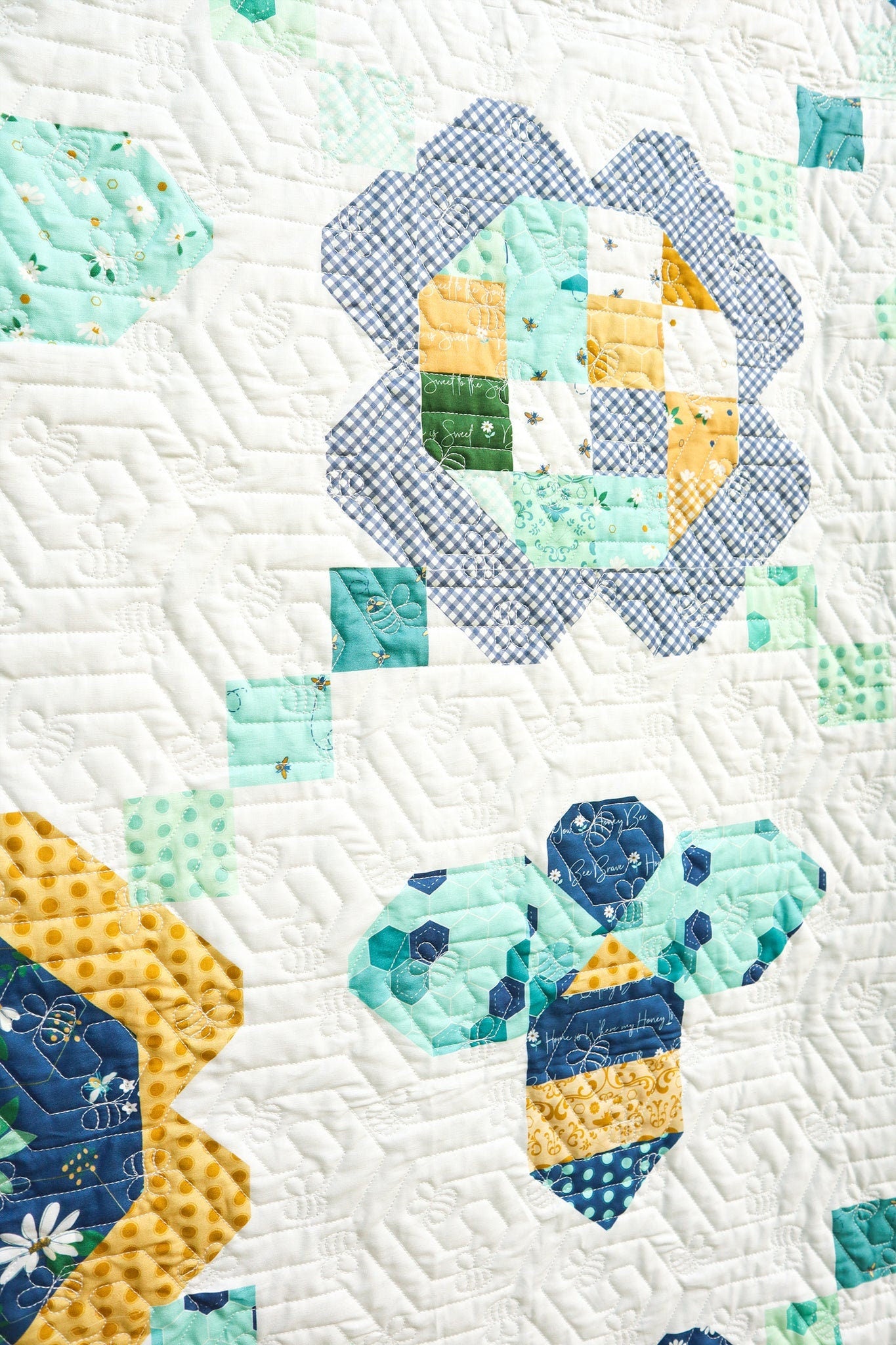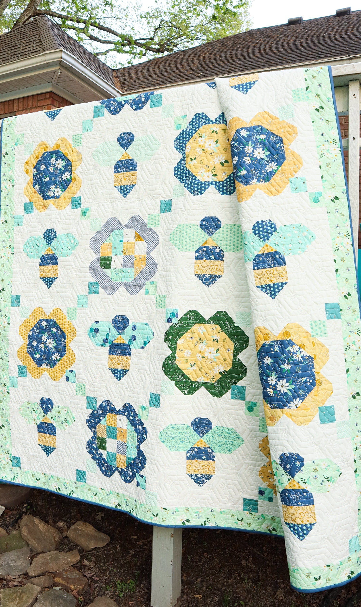 The Daisy a Day Quilt by Beverly McCullough of Flamingo Toes features alternating daisy and bee blocks and is fat quarter friendly. Finished size is 79" x 92".