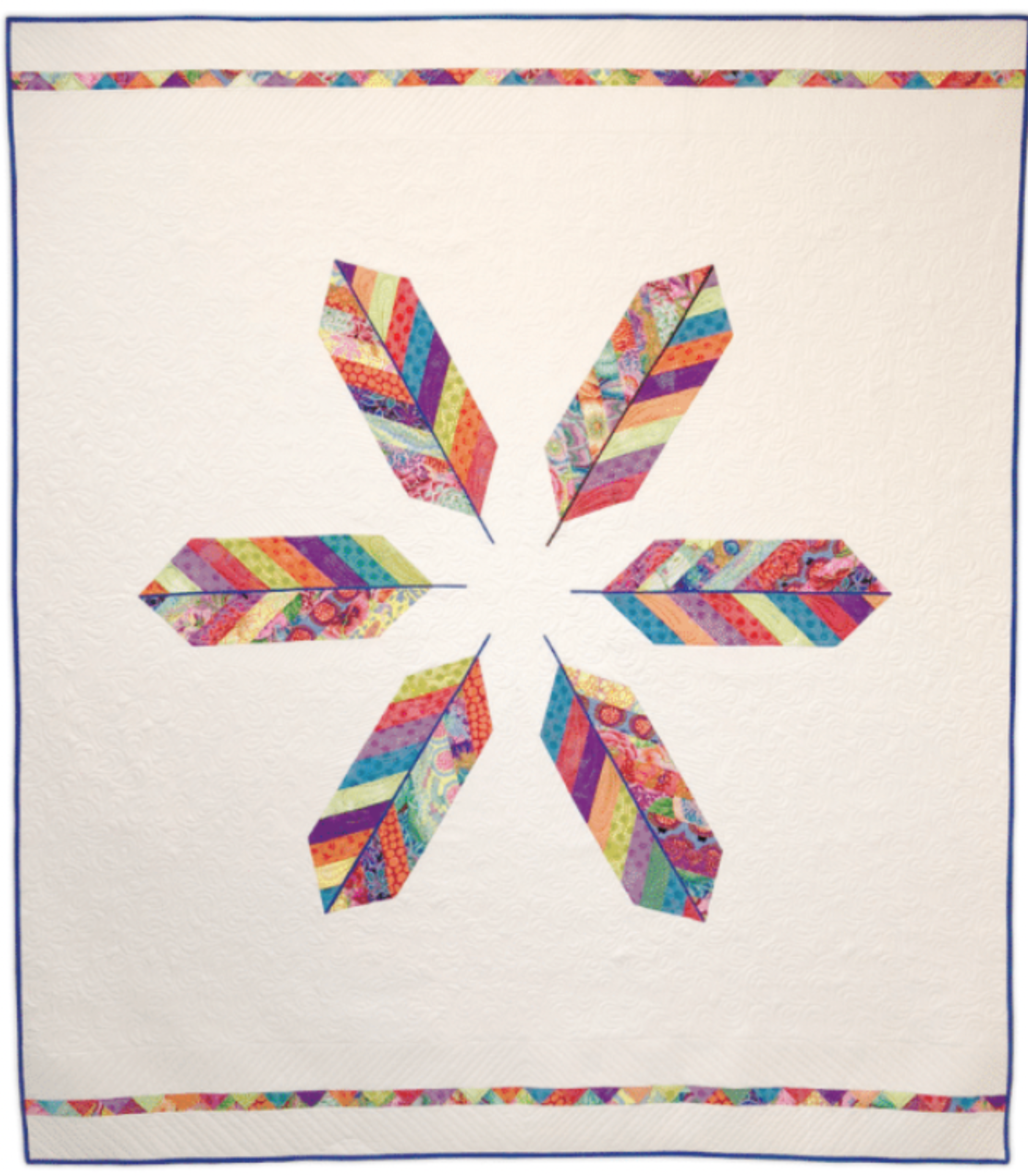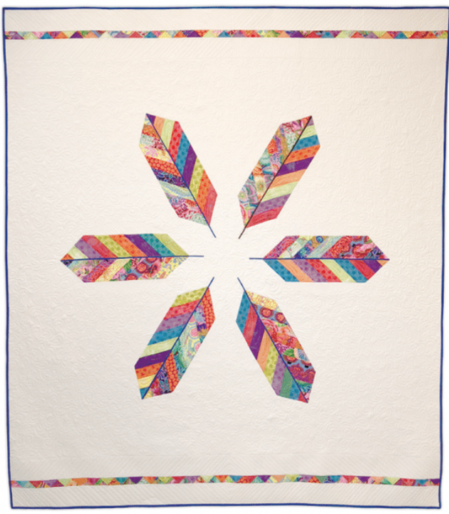 These colorful feathers are fun and easy to make, using a braid technique. You can quickly piece all six feathers and unique top and bottom border all at once! Using the 60 degree Equilateral ruler for trimming up the bottom of individual feathers guarantees a flat center every time. Finish Size 86" X 96"