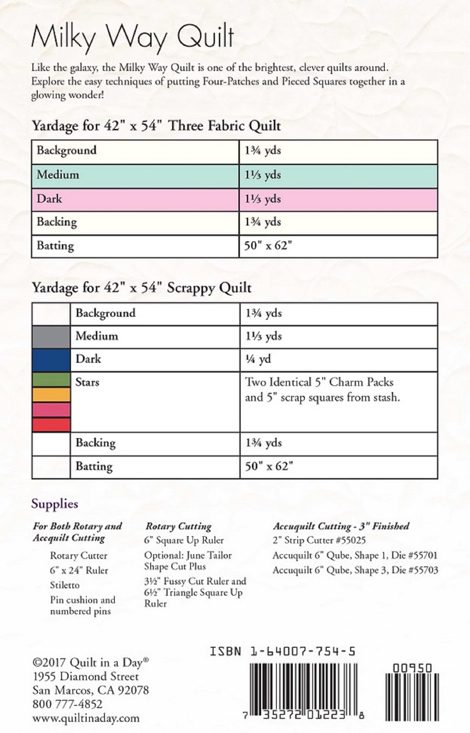 Like the galaxy, the Milky Way Quilt is one of the brightest, clever quilts around. Explore the easy techniques of putting Four-Patches and Pieced Squares together in a glowing wonder! The Milky Way Quilt pattern by Eleanor Burns! Eleanor‘s innovative methods have updated this treasured old pattern, making it fast and easy. This full-color pattern provides easy to follow directions, suitable for both advanced and beginner quilters. This pattern has directions for rotary cutting or Accuquilt cutting, use either method or combine both, the choice is yours.
