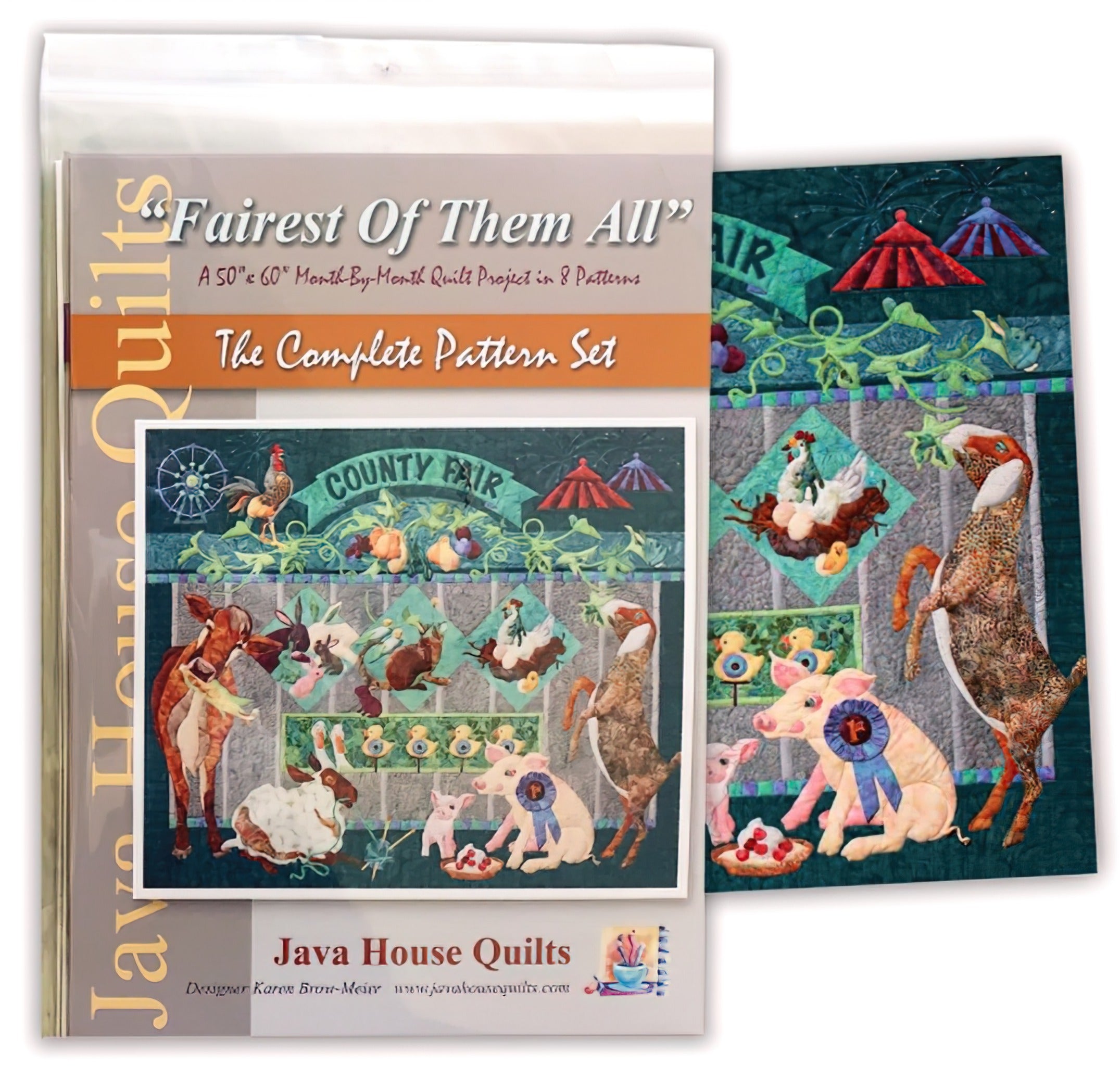 This county fair quilt pattern features applique pigs, chickens, rabbits, cat, cow, goat, sheep and more! The 8-pattern set includes full-size images and step by step instructions and is suitable for hand applique or fusible applique methods. Beaded fire works, a "County Fair" banner, big top tents, a Ferris Wheel and gorgeous, leafy vines are shown here with Hoffman batiks and hand-dyes. Contemporary colors and Java House Quilts personality make it a joy to create this "prize winning entry....