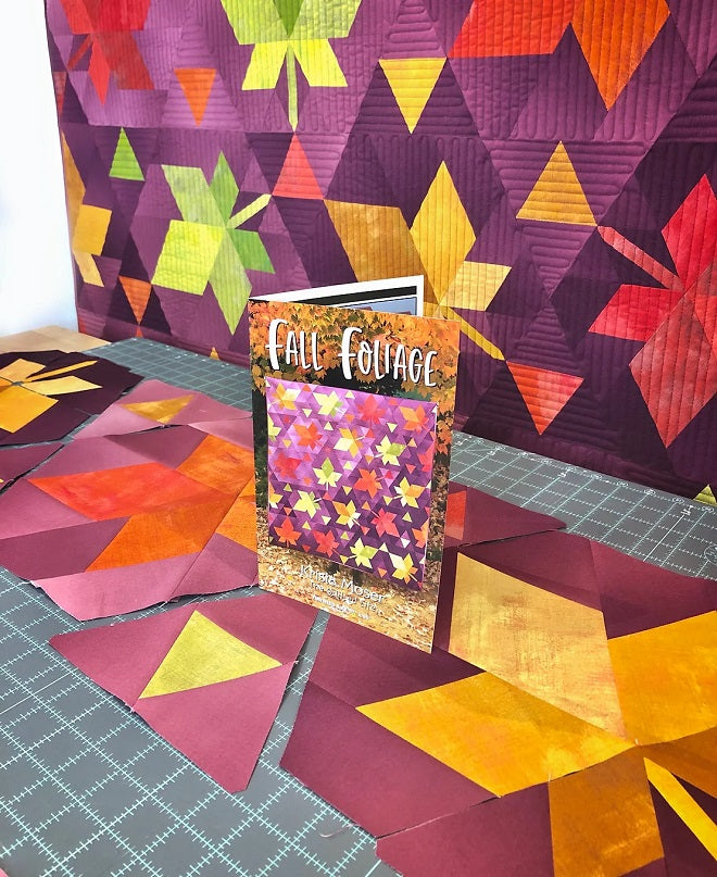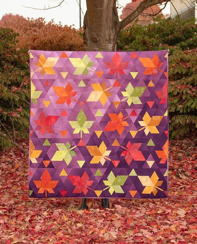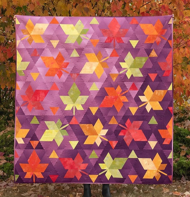 Fall in love with 60-degree angles with Krista Moser's latest pattern, Fall Foliage. This pattern uses the Creative Grids 60-degree Diamond Mini Ruler to cut a variety of shapes including diamonds, triangles, and trapezoids to make these beautiful fall leaves. There are two main blocks in this quilt, the leaves and the setting triangle units. These are made from simple shapes letting the fabric and shade do the heavy lifting to get the wow factor. This quilt is constructed into blocks first and then rows with no Y seams, making construction a breeze with well-illustrated step-by-step instructions. Finished Size: 57" X 60".