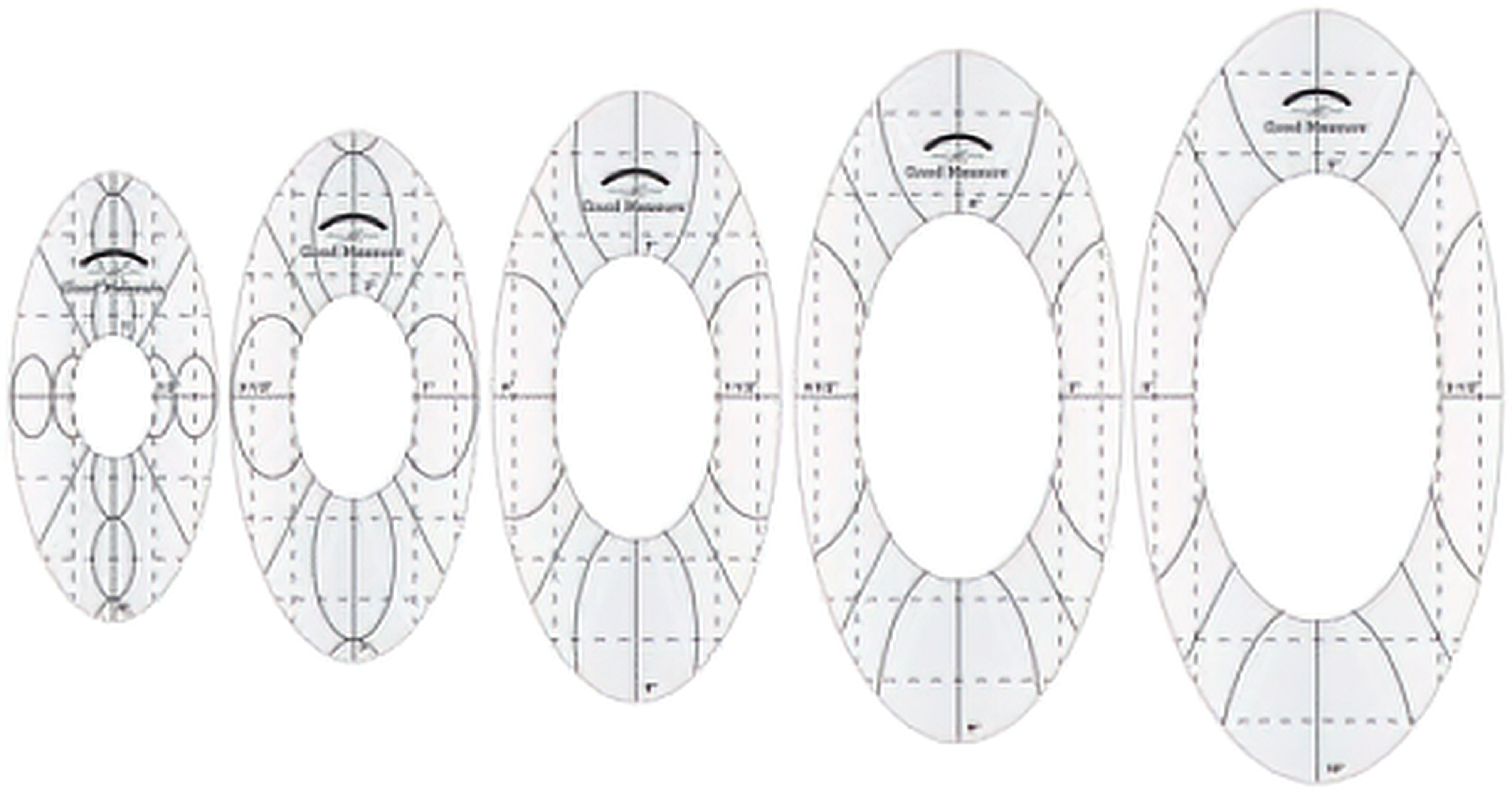 This set of five rulers helps stitch circles ranging in size from 1/2” x 1” to 5” x 10”. The measurements on the rulers are those of the stitched ovals. There are many markings on these rulers, making them easy to use for many quilting applications.