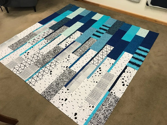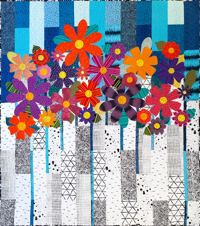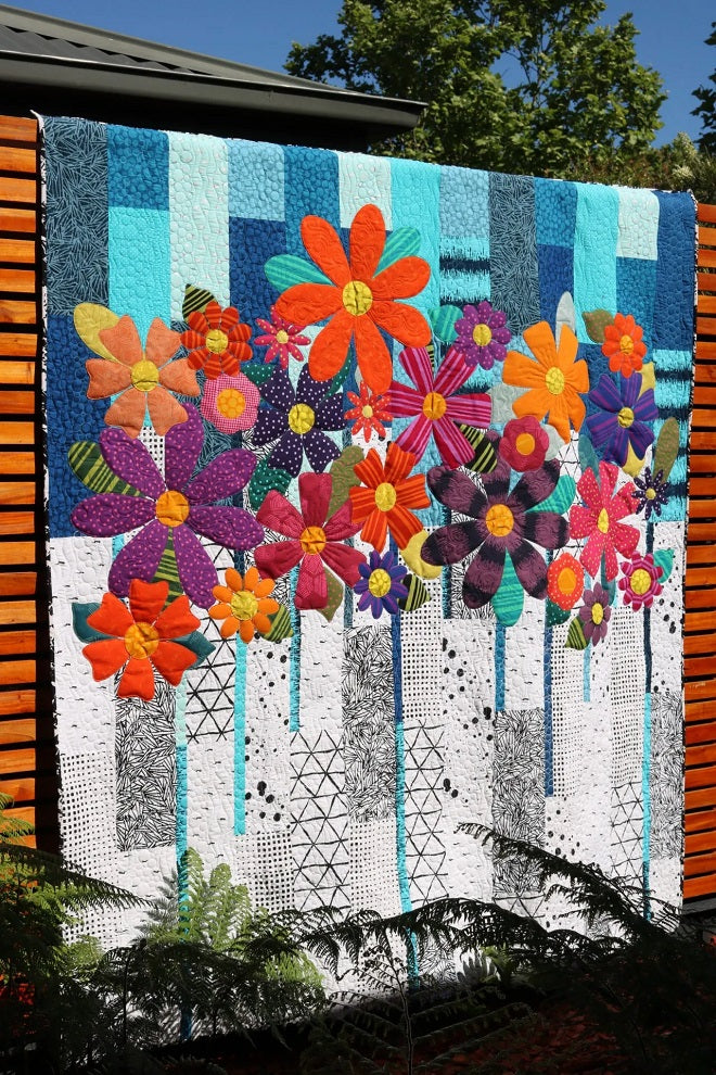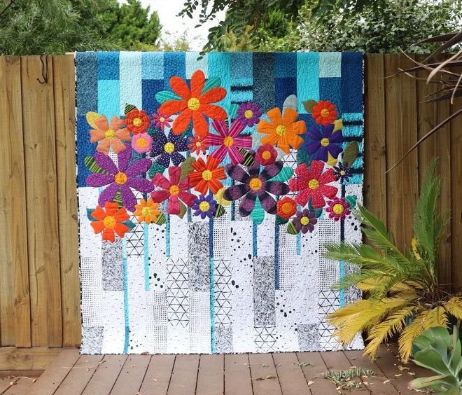 Indah Blossoms is a beautiful, bright floral lap size quilt. The very simple but effective pieced top is made from a selection of contrasting fat quarters. Favorite scraps of fat sixteens are perfect for the applique flowers. This quilt is made in three sections, making it easier to sew on the applique pieces. Finished Size: 79" x 72". Designed by Carolyn Murfitt of Freebird Quilting Designs.