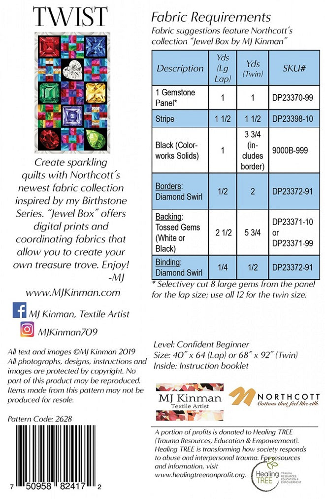 Textile artist MJ Kinman celebrates her newest collection with Northcott Fabrics with four new patterns. TWIST features the luminous gemstone panel and stripe fabric in a traditional bock design with dramatic effect. Create your own glowing treasure trove.