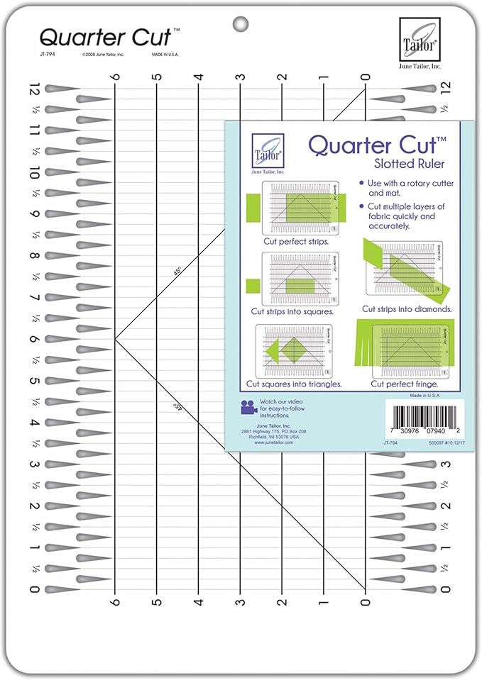 Use the June Tailor Quarter Cut on quilt fabrics to accurately produce numerous strips in 0. 25 inch even increments. This rotary ruler can then be turned to create different shapes like squares triangles hexagons and diamonds. You can also use it to create a fringe design. Designed to cut through multiple layers of fabrics at one go this ruler is a must-have for quilters. Cut bias strips using the 45-degree marking. It works with the rotary cutter and rotary cutting mat.