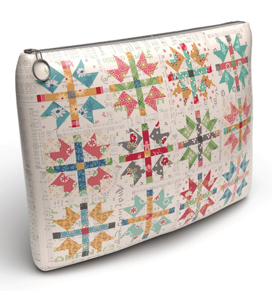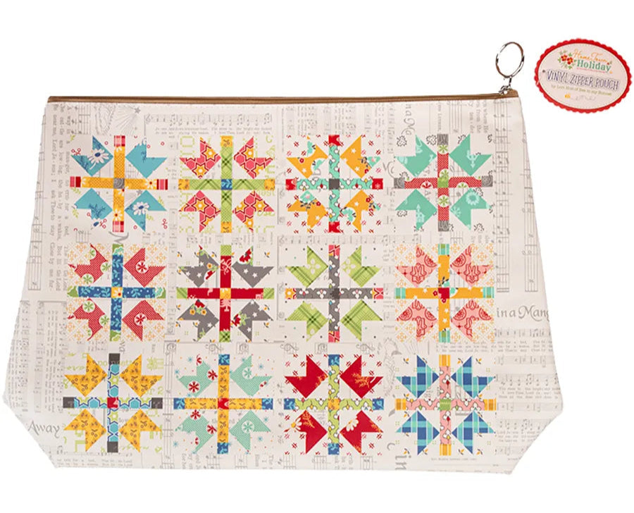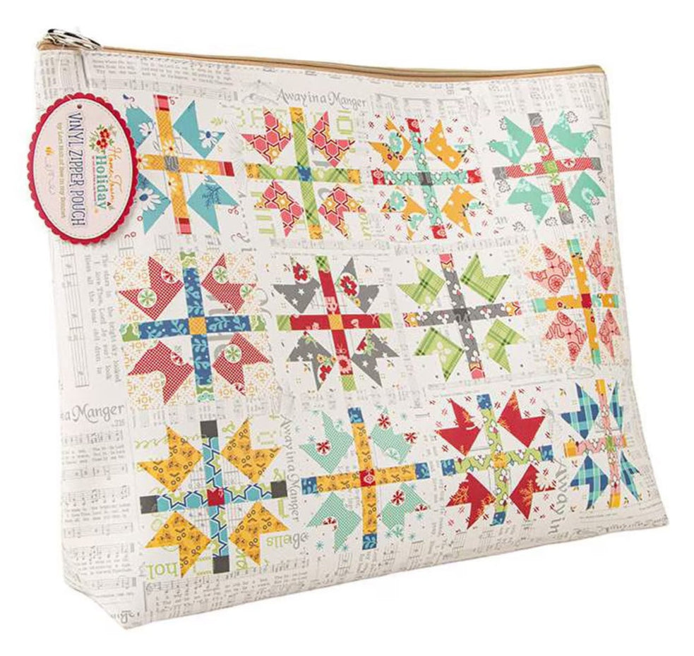 The Home Town Holiday Vinyl Project Bag by Lori Holt of Bee in my Bonnet is a lovely vinyl zipper pouch that is perfect for cosmetics, sewing supplies, or craft projects. This beautiful zipper pouch is lined with 100% cotton. Size is approximately 9" x 12".