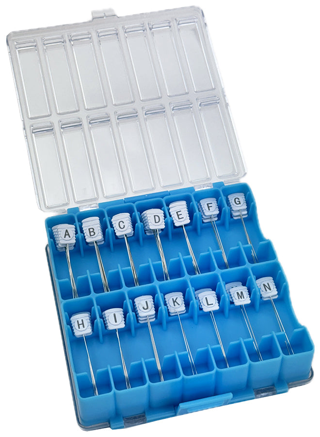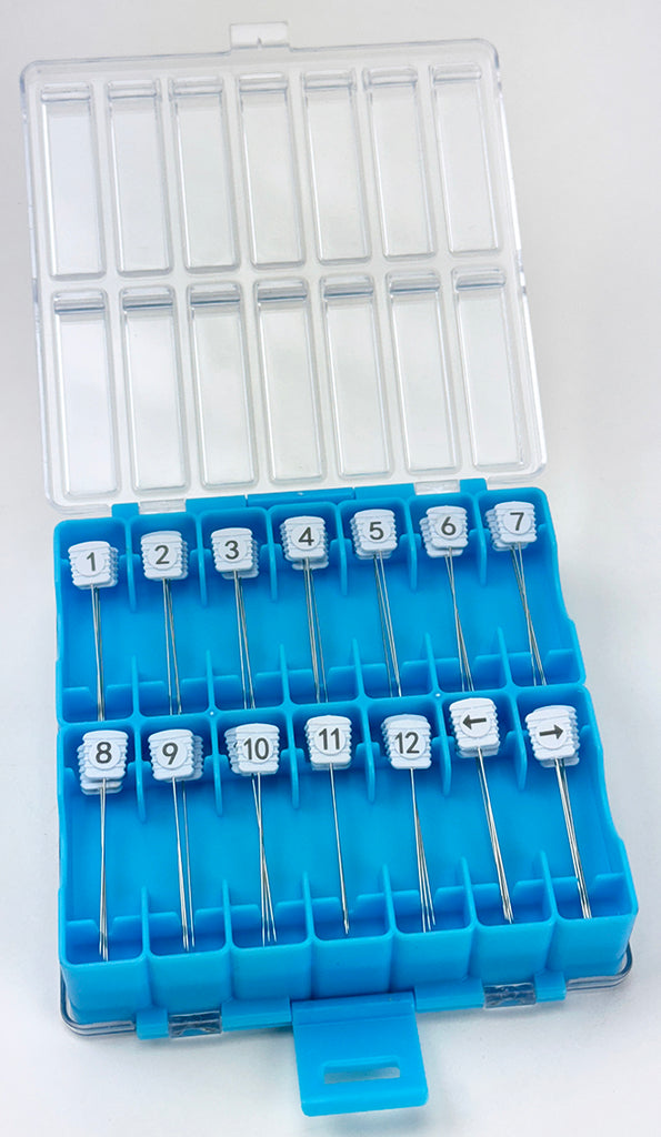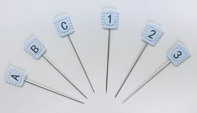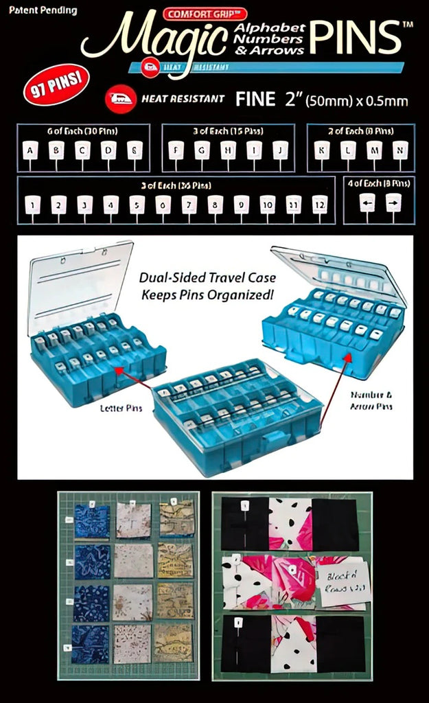Comfort Grip, Heat Resistant, 97 pieces. The Comfort Grip Magic Alphabet, Numbers & Arrows Pins are strong and sharp which will assist you in your quilt layout. They have a comfort grip that makes picking up and maintaining a grip on the pin, easy. The Alphabet pins are ideal for identifying the block letters. The number pins identify the rows. The combination of Numbers and Alphabet can be used to identify the position in the quilt and the Arrow pins are great for marking the direction of a particular row. The pins come in a dual sided travel case for easy storage. 2"x 0.5mm Contains: 53 Alphabet Pins, 36 Numbered Pins, 8 Arrow Pins.