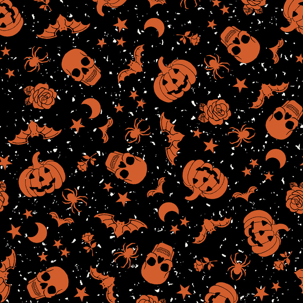 Join us at Goth Gardens for frightful festivities! You will be greeted by smiling skulls, jack-o-lanterns, haunted roses, and creepy crawlies as you wander through the moonlit garden. Flecked blenders in orange, black, and white add background texture and interest. With large, medium, and small-scale prints that pair perfectly together, Goth Gardens will make you shiver with anticipation.