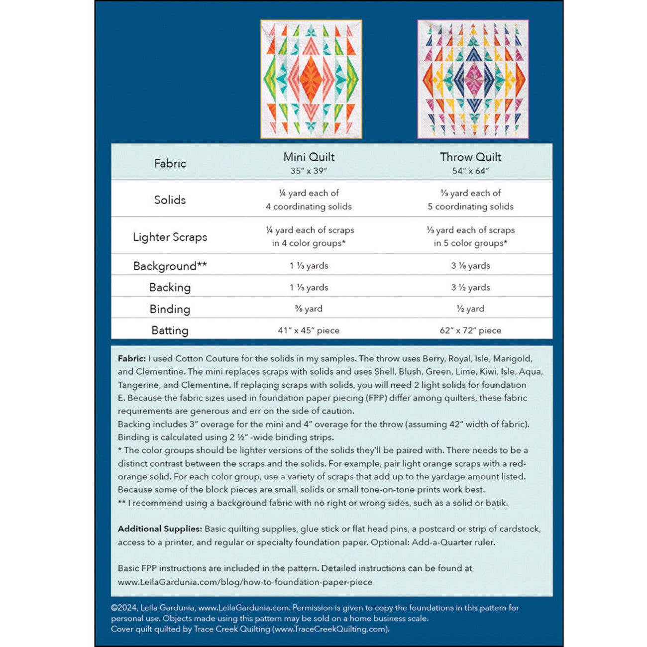 Mirrored Diamonds, a modern foundation paper-pieced quilt pattern, contains instructions for a striking quilt in two sizes. Five different half-rectangle triangle blocks in 5 sizes combine to make a quilt that looks like it is rippling out from the center. All foundations are contained in the pattern but will need to be photocopied before piecing begins. Throw measures: 54” x 64”. Mini measures: 35” x 39”.