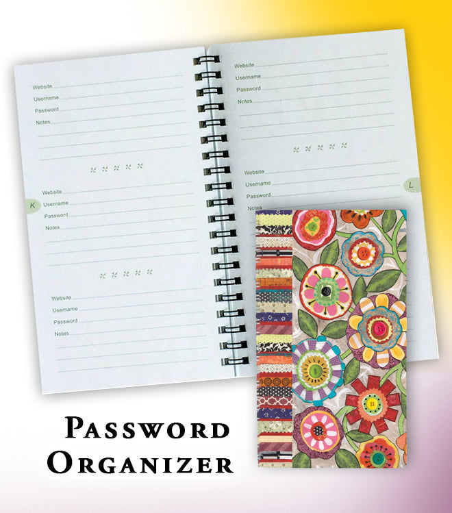 Wire-O bound soft-cover password organizer with full-color art front and back. 4-3/8" x 7" size with 80 alphabetized and prompted pages for 240 entries of login and password information. Half sheet with product information is to be removed by the consumer to reveal full-page design, leaving an inconspicuous way to keep personal information.