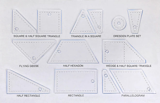 Make intricate quilt blocks out of 2 1/2' strips and 2 1/2" templates. This Patriotic Sampler Quilt Kit includes instructions, fabric for the Quilt Top, and 13 piece 2.5" template set including 2 1/2 inch Square, Half rectangle, Parallelogram, Triangle in a Square, Flying Geese, and many more! These templates make it fun to cut and sew with perfect ready to sew shapes. Mix and Match for 100's of possibilities.