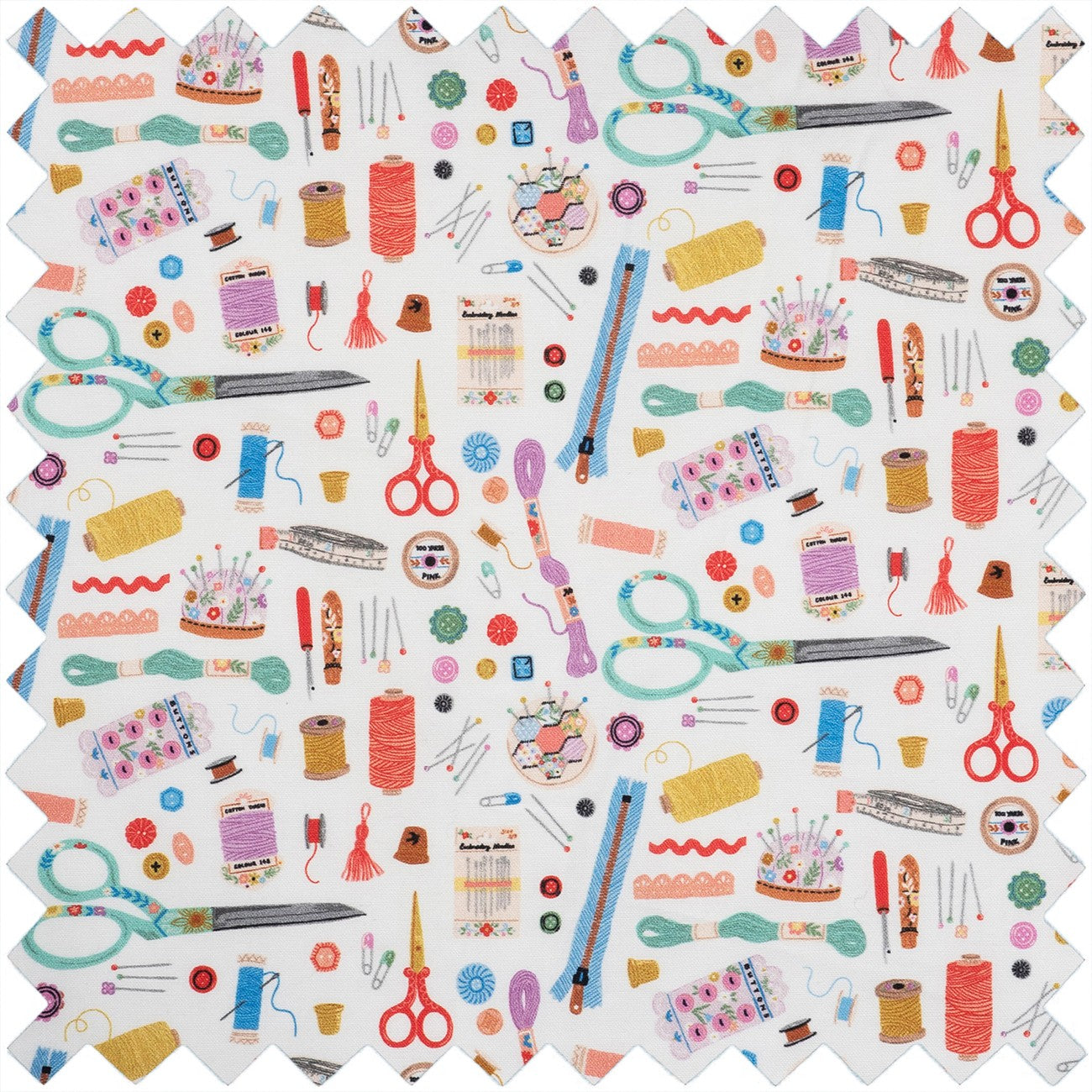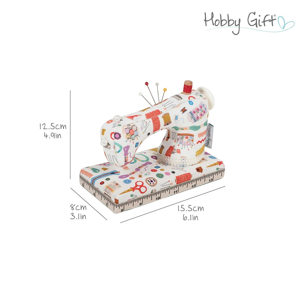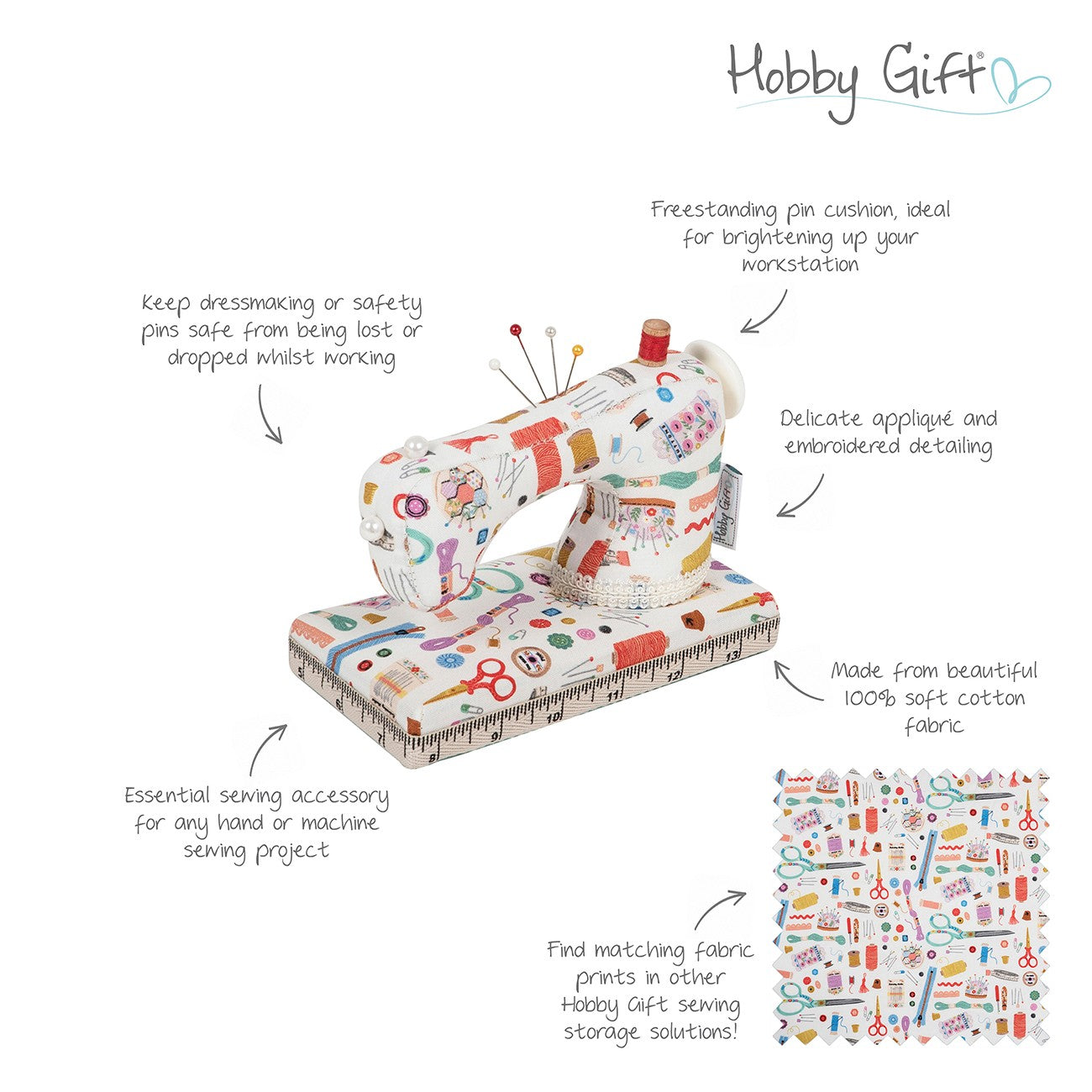 Elevate your sewing workspace with this charming freestanding pincushion shaped like a vintage sewing machine, crafted from 100% soft cotton for a plush feel that's both functional and delightful. Adorned with vibrant multicolored prints featuring playful sewing notions such as scissors, threads, buttons, measuring tapes, and needles in shades of pink, blue, yellow, and red on a crisp white background, it boasts deluxe applique and embroidered detailing for an eye-catching appeal. The base includes a printed measuring tape edge for added utility, while the top holds pins securely with a realistic spool and knob accents, preventing them from getting lost during your hand or machine sewing projects. Ideal for brightening up any workstation, this essential accessory combines practicality with whimsical style, making it a perfect gift for crafters who appreciate matching fabric prints on other sewing storage solutions. Measuring 12.5cm in height, 15.5cm in width, and 8cm in depth, it's compact yet sturdy, ensuring pins stay safe and organized.
