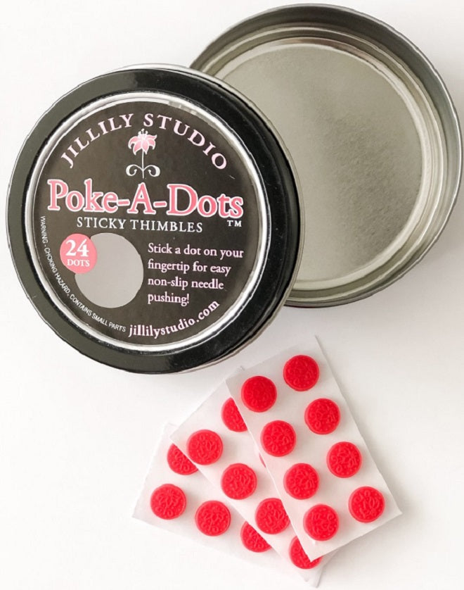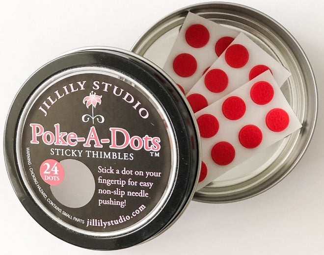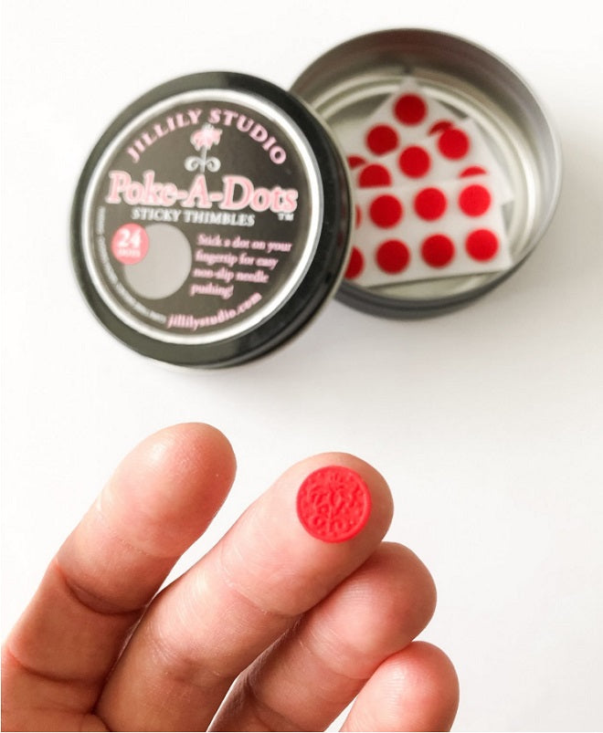 Little sticky thimbles that you place on your fingertip. The surface is textured to prevent the needle from slipping. Place them anywhere you need them so you don't get poked. A great tool for hand sewing, stitching on binding, sewing on a button, or hand applique and embroidery. They come with 24 DOTS packaged in a cute little round tin. (Great to put your needles and thread in there, too!)