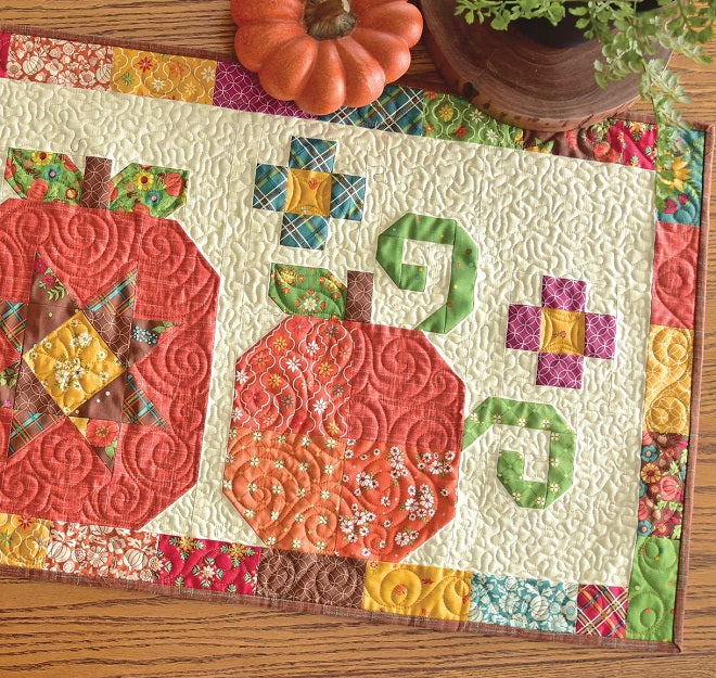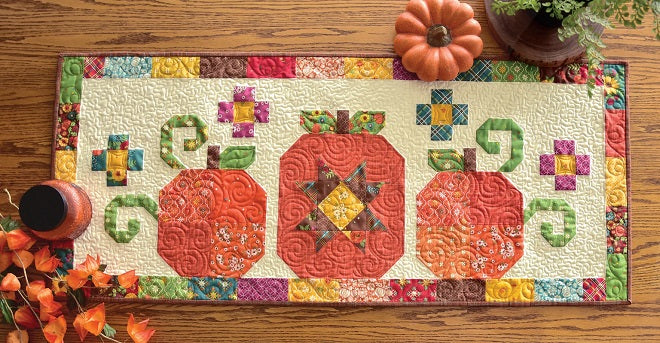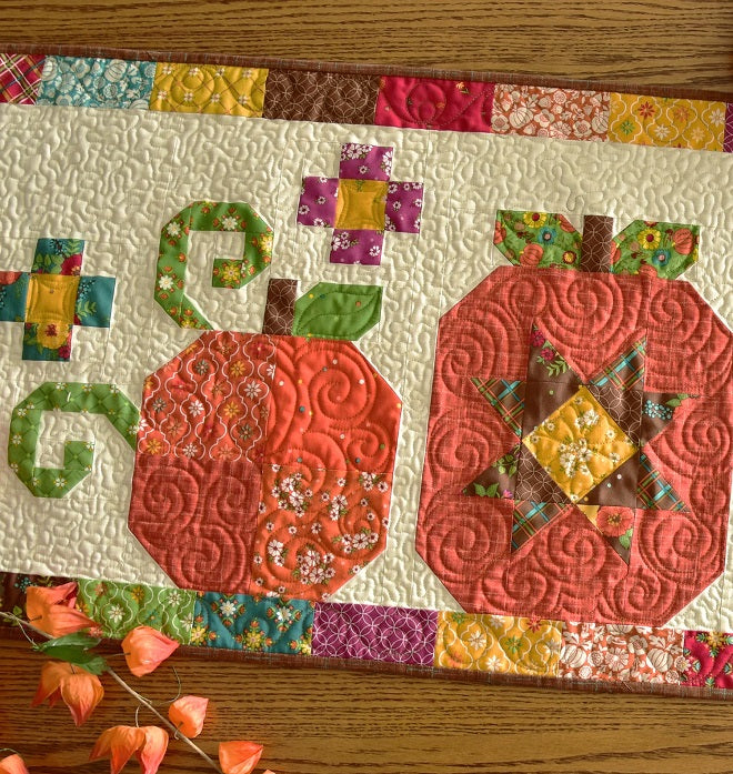 Pumpkin Trio is a Charm Pack friendly pattern by Heather Peterson of Anka’s Treasures. Traditionally pieced using folded corners. The finished size of the runner is 21” x 51”.