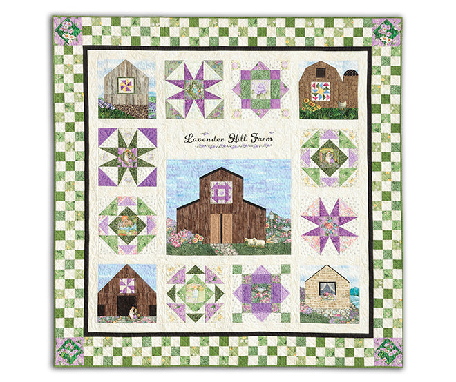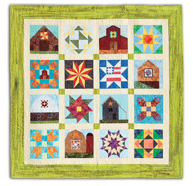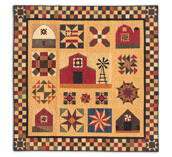 Blocks include: Hole in the Barn Door, Monitor Barn with Windmill, End of the Day, Dutch Barn, Broken Wheel, Farmer's Daughter, Country Lanes, Gothic Barn, Quatrefoil, Cups and Saucers, Corn and Beans, Hens and Chicks, Flying Geese, Gambrel Roof Barn, Country Clothesline, Peaceful Pasture, Americana Star, Flying Kite, Bank Barn, Dora's Delight, North Star, and Harvest Star.