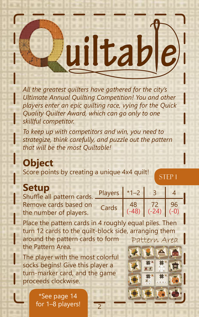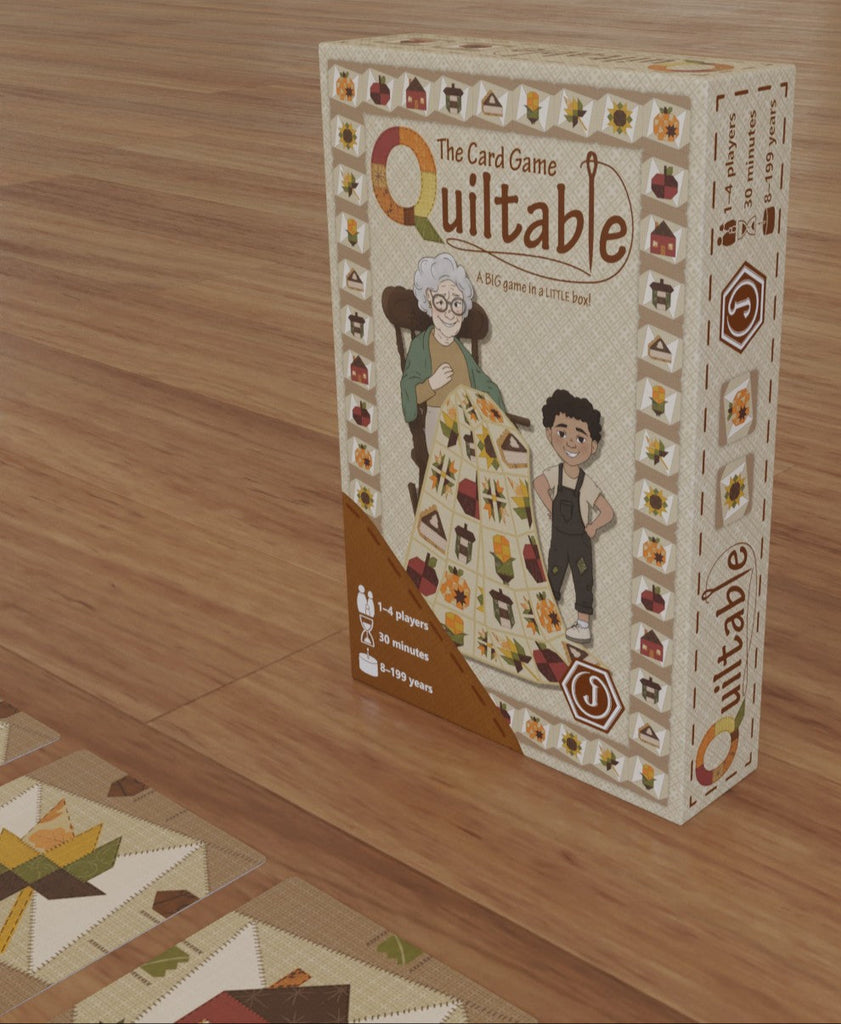 Quiltable is an engaging card game for 1–4 players where you will piece together a cozy fall quilt while competing for the Quick Quality Quilter award. Quiltable can be a fun experience for any group, and is a great way to build friendships, unwind after a long day, and create fond memories with those you love.