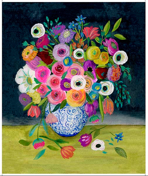 Let your creativity bloom! A 36” panel features a colorful and stylish bouquet paired with floral coordinates and blenders to create unique and on trend projects. Perfect for home décor accents, chic quilts, and accessories. ©Suzanne Allard