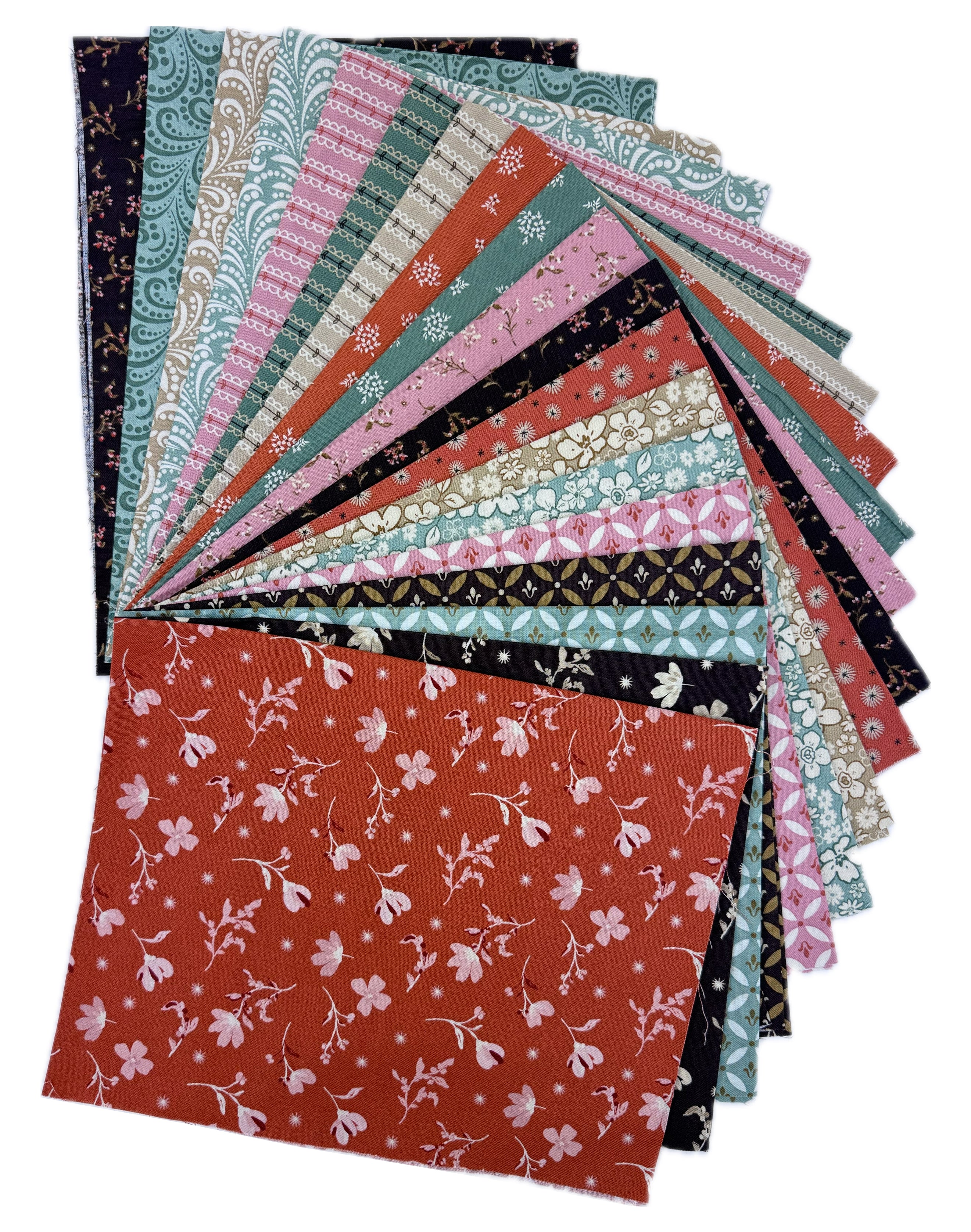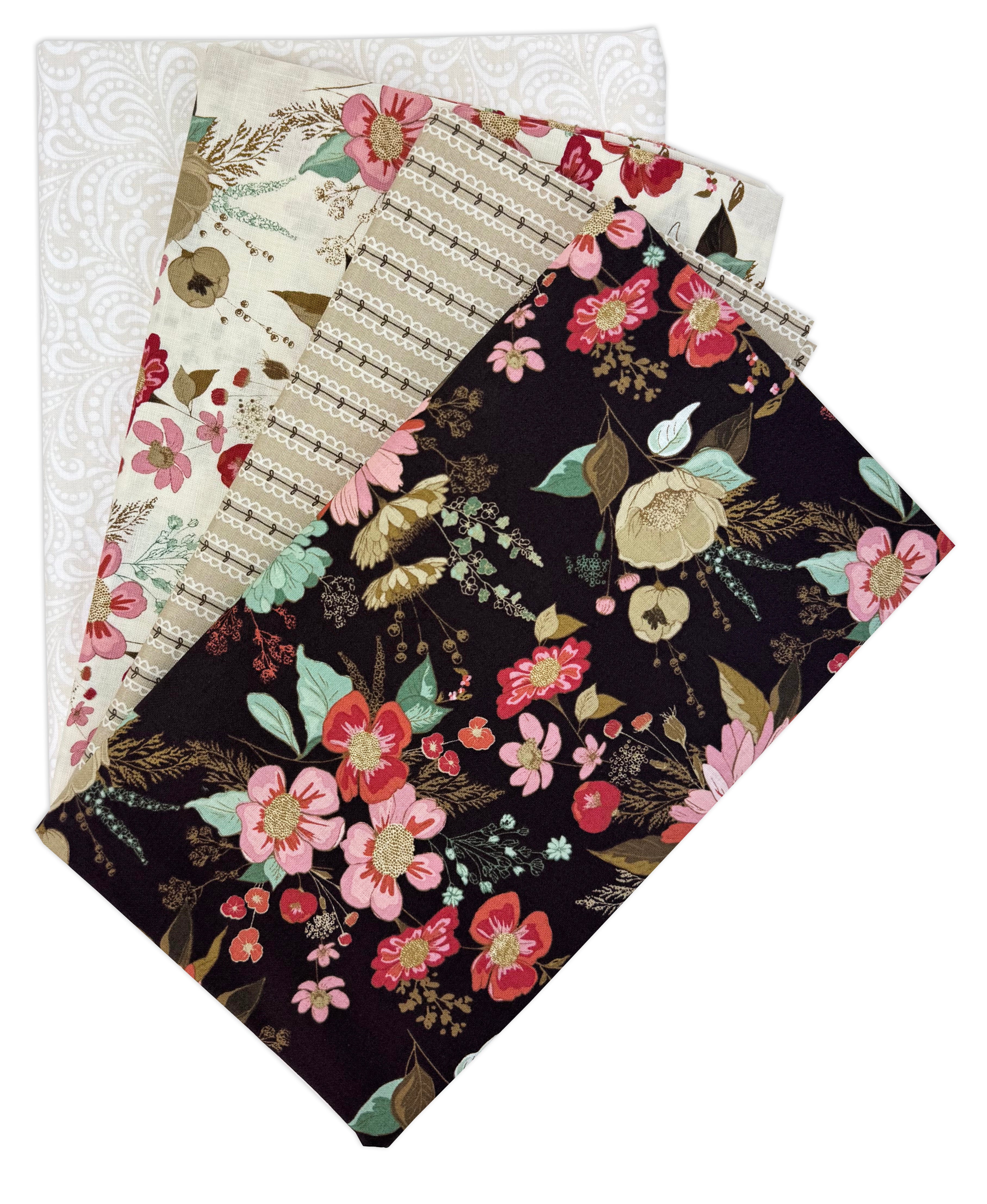 The Let's Get Fancy Quilt Kit includes pattern and fabric for quilt top and binding. Backing not included. Fabric featured is Morning Latte by Sandy Gervais of Pieces from My Heart. Pattern is also by Sandy Gervais. Finished size is 80 1/4" x 102 1/4". Kit comes in a solid box with a printed belly band label. Box size is approximately 11" x 12 1/4" x 3 1/2".
