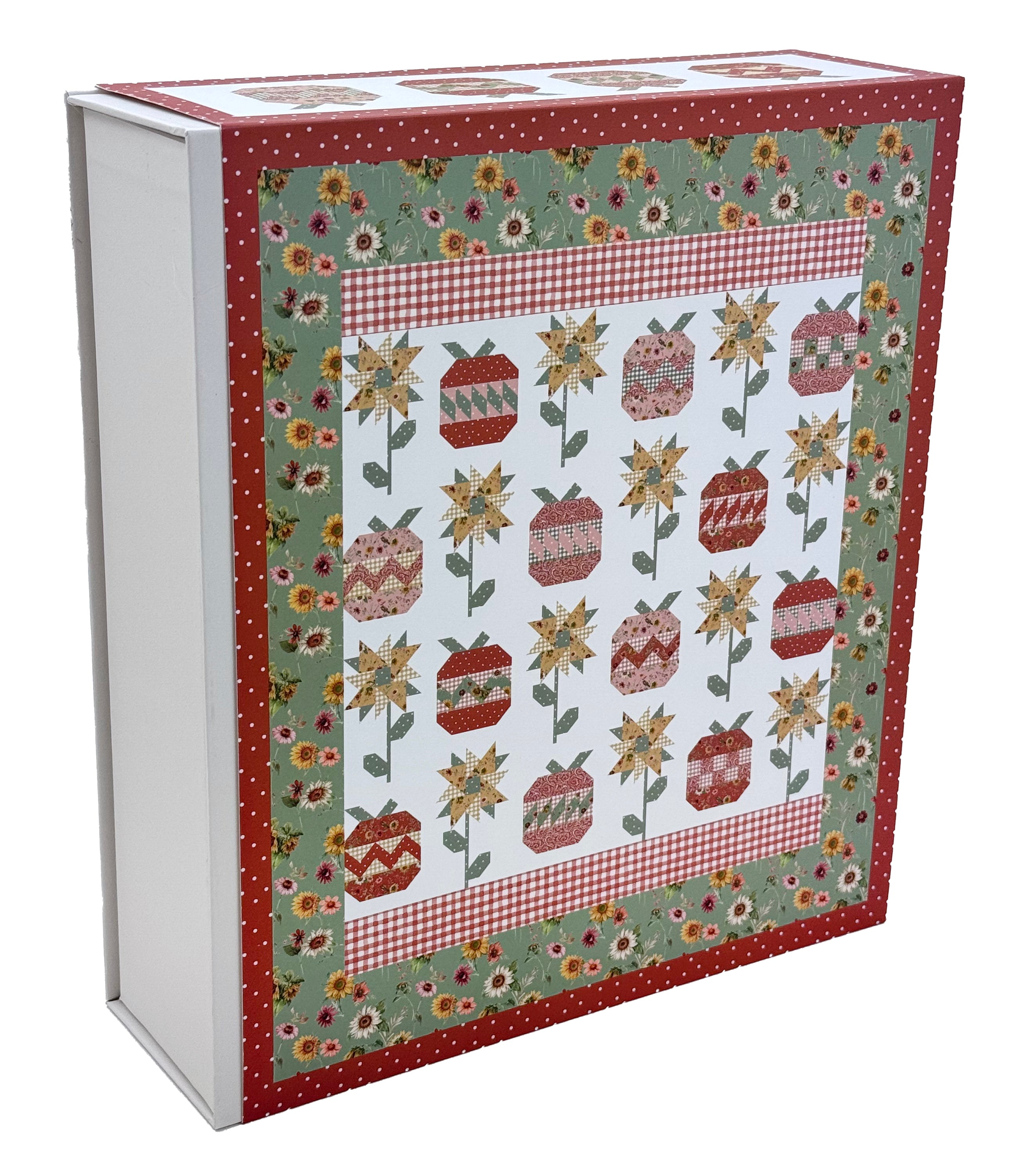 The Fall Garden Quilt Kit includes pattern and fabric for quilt top and binding. Backing not included. Fabric featured is by Lisa Audit. Pattern is by LaVonne Jackson of Sew-N-Quilt. Finished size is 84" x 84". Kit comes in a solid box with a printed belly band label. Box size is approximately 11" x 12 1/4" x 3 1/2".