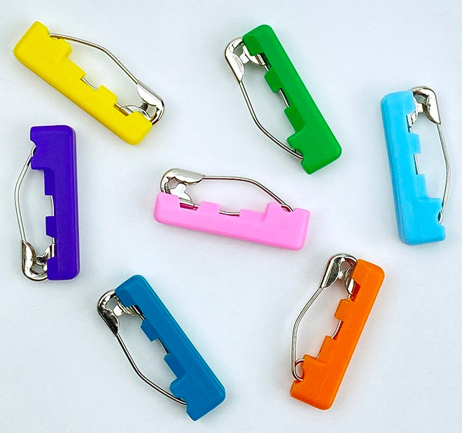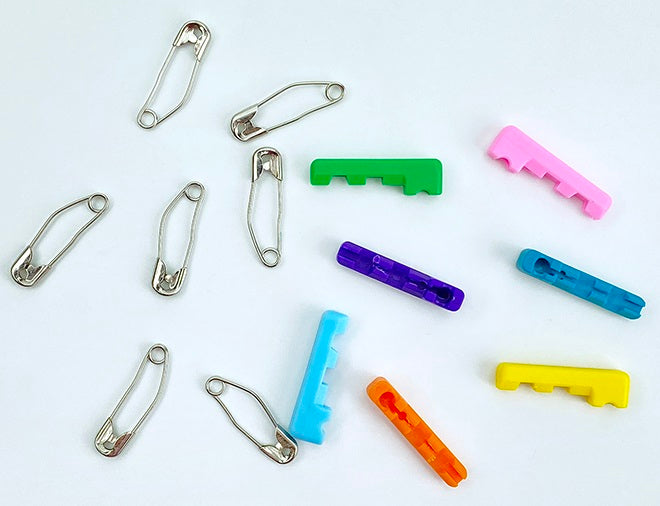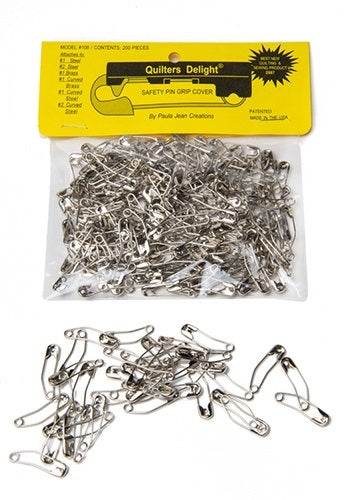 Safety Pin Grip Covers Will make your safety pins easier to handle, easier to use, also easier to find and pick up. They will help keep your pins from becoming tangled while being stored. Using safety pins with pin covers on them along with the Kwik Klip tool will help you baste your quilt faster and easier. They attach to #1 & #2, straight or curved safety pins. Use the FREE needle nose pliers to click safety pins into pin covers.
