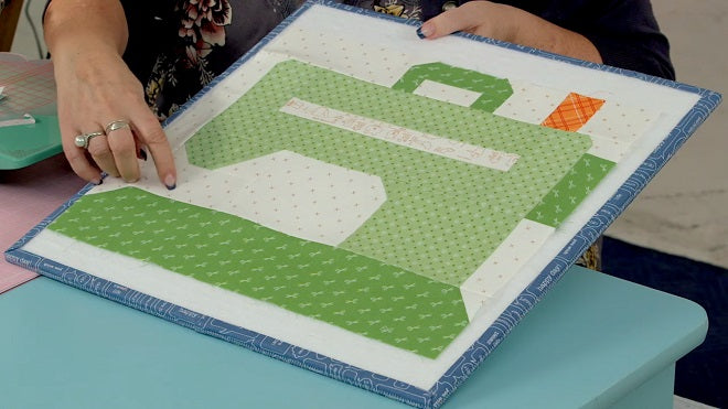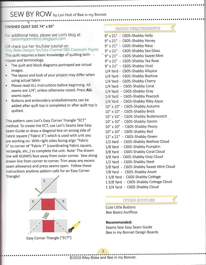 The Sew by Row Quilt by Lori Holt of Bee in my Bonnet features rows of quilty notions including scissors, pin cushions, sewing machines, quilt blocks, irons, spools of thread, and fabric bundles. Finished size is 74" x 85".