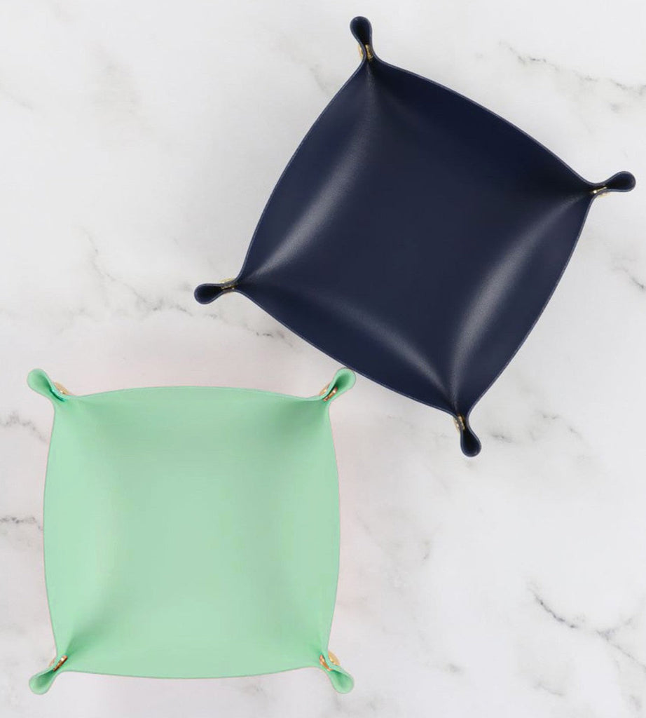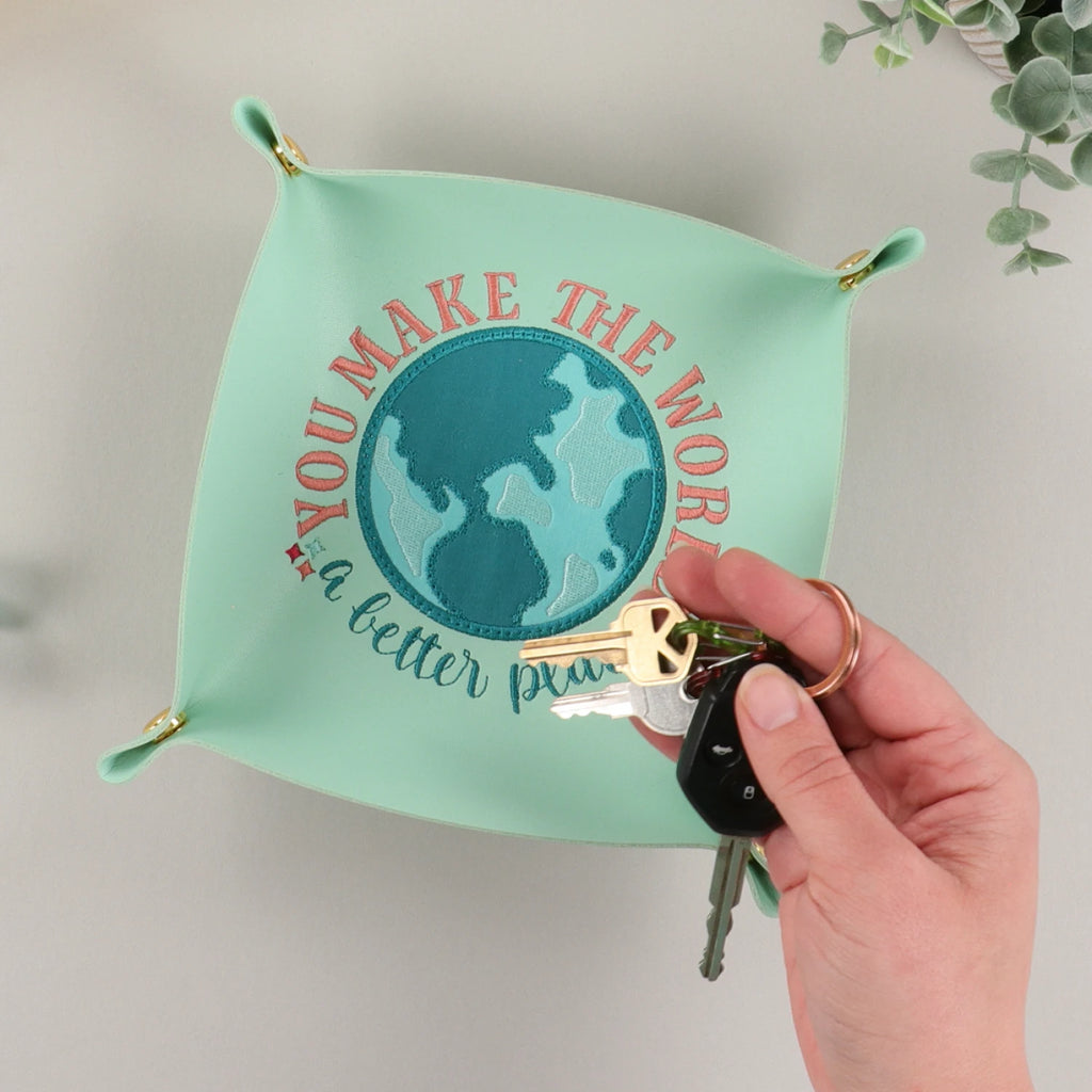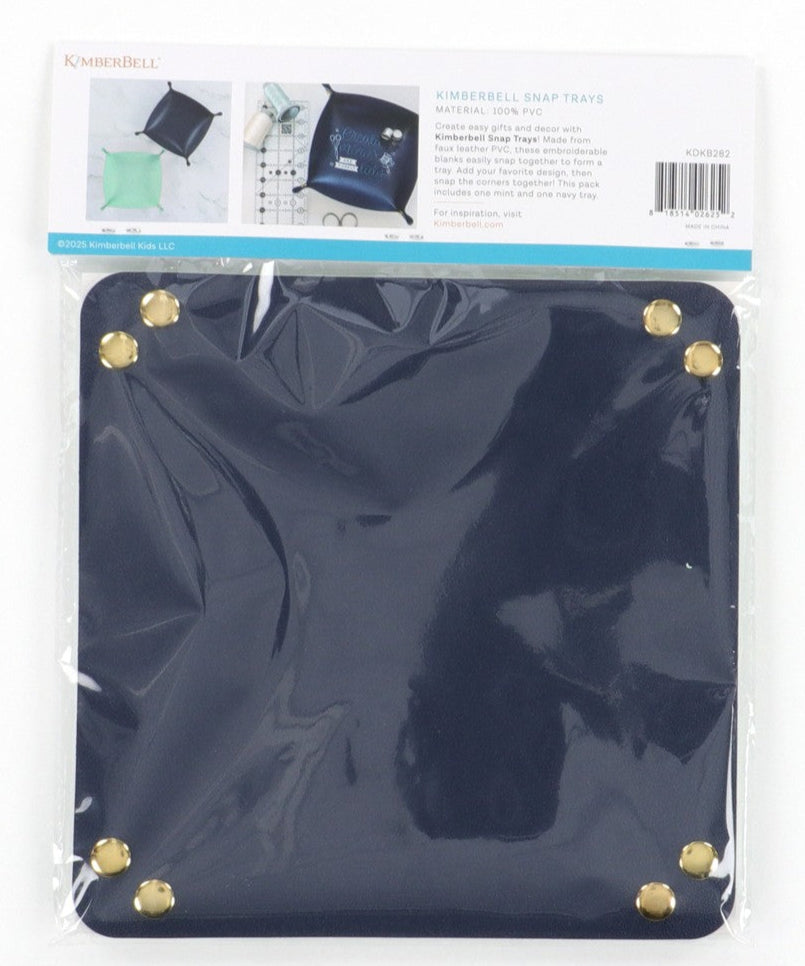 Create easy gifts and decor with Kimberbell Snap Trays! Made from faux leather PVC, these embroiderable blanks easily snap together to form a tray. Add your favorite design, then snap the corners together! This pack includes one mint and one navy tray.