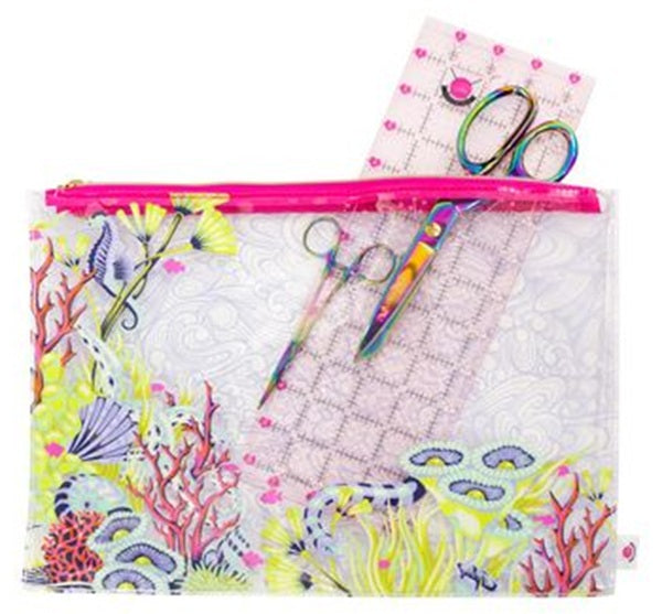 The Tula Pink Floral Reef Medium Zip Project Bag measures at 14in x 10in with gusset.