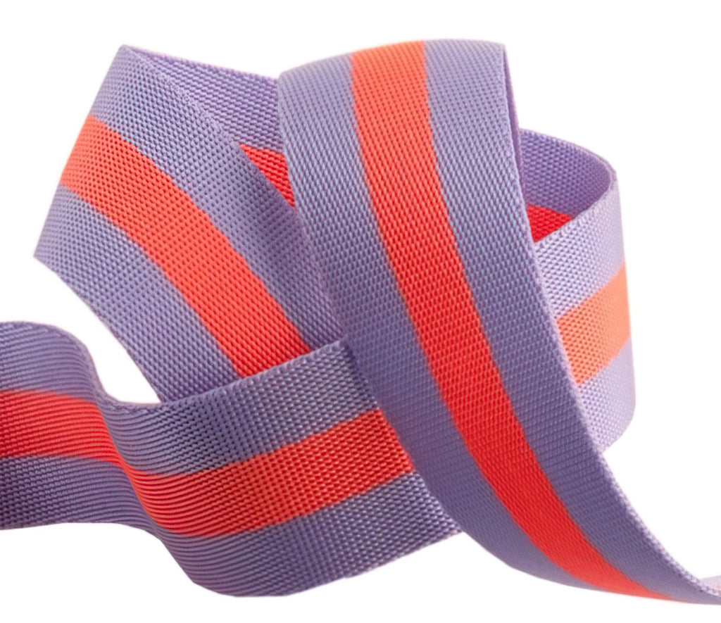 Tula Pink striped Nylon Webbing 1.5" wide - Lavender with Neon Peach. A game Changer in Bag Making! I do not think I will use any other webbing again! I just like it that much! This webbing makes a bag feeling elevated, gives it a more professional look. 2 yards.